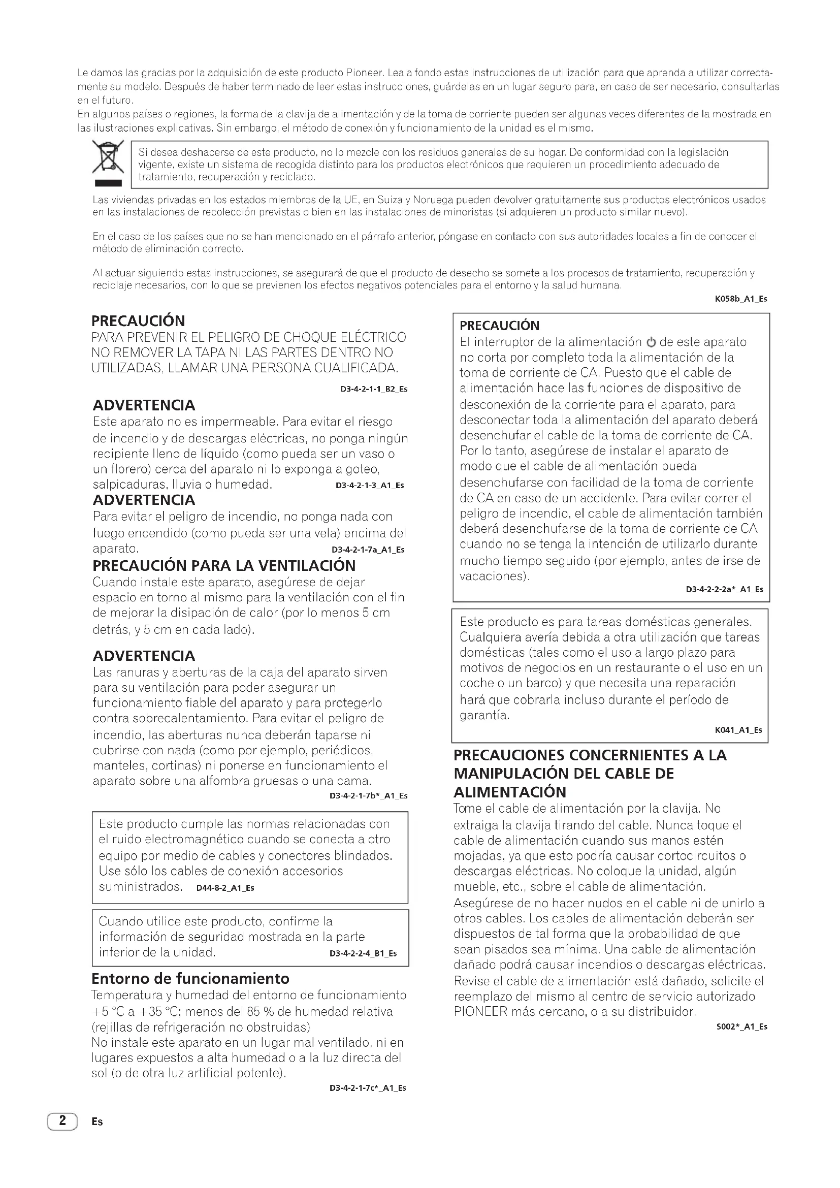 Le damos las gracias por la adquisición de este producto Pioneer. Lea a fondo estas instrucciones de utilización para que aprenda a utilizar correcta- mente su modelo. Después de haber terminado de leer estas instrucciones, guárdelas en un lugar seguro para, en caso de ser necesario, consultarlas en el futuro. En algunos países o regiones, la forma de la clavija de alimentación y de la toma de corriente pueden ser algunas veces diferentes de la mostrada en las ilustraciones explicativas. Sin embargo, el método de conexión y funcionamiento de la unidad es el mismo. PRECAUCIÓN PARA PREVENIR EL PELIGRO DE CHOQUE ELÉCTRICO NO REMOVER LA TAPA NI LAS PARTES DENTRO NO UTILIZADAS, LLAMAR UNA PERSONA CUALIFICADA. D3-4-2-1-1_B2_Es ADVERTENCIA Este aparato no es impermeable. Para evitar el riesgo de incendio y de descargas eléctricas, no ponga ningún recipiente lleno de líquido (como pueda ser un vaso o un florero) cerca del aparato ni lo exponga a goteo, salpicaduras, lluvia o humedad. D3-4-2-1-3_A1_Es ADVERTENCIA Para evitar el peligro de incendio, no ponga nada con fuego encendido (como pueda ser una vela) encima del aparato. D3-4-2-1-7a_A1_Es