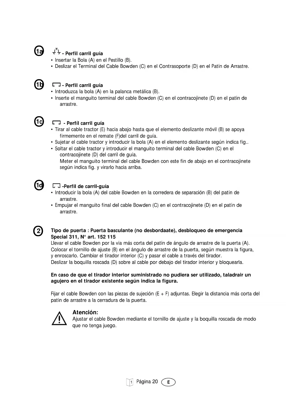 Tipo de puerta : Puerta basculante (no desbordaate), desbloqueo de emergencia Special 311, N° art. 152 115 Llevar el cable Bowden por la vía más corta del patín de ángulo de arrastre de la puerta (A). Colocar el tornillo de ajuste (B) en el ángulo de arrastre de la puerta, según muestra la figura, y enroscarlo. Cambiar el tirador interior (C) y pasar el cable a través del tirador. Deslizar la boquilla roscada (D) sobre al cable por debajo del tirador interior y bloquearla. En caso de que el tirador interior suministrado no pudiera ser utilizado, taladrair un agujero en el tirador existente según indica la figura. Fijar el cable Bowden con las piezas de sujeción (E + F) adjuntas. Elegir la distancia más corta del patín de arrastre a la cerradura de la puerta. Atención: Ajustar el cable Bowden mediante el tornillo de ajuste y la boquilla roscada de modo que no tenga juego. - Perfil carril guía