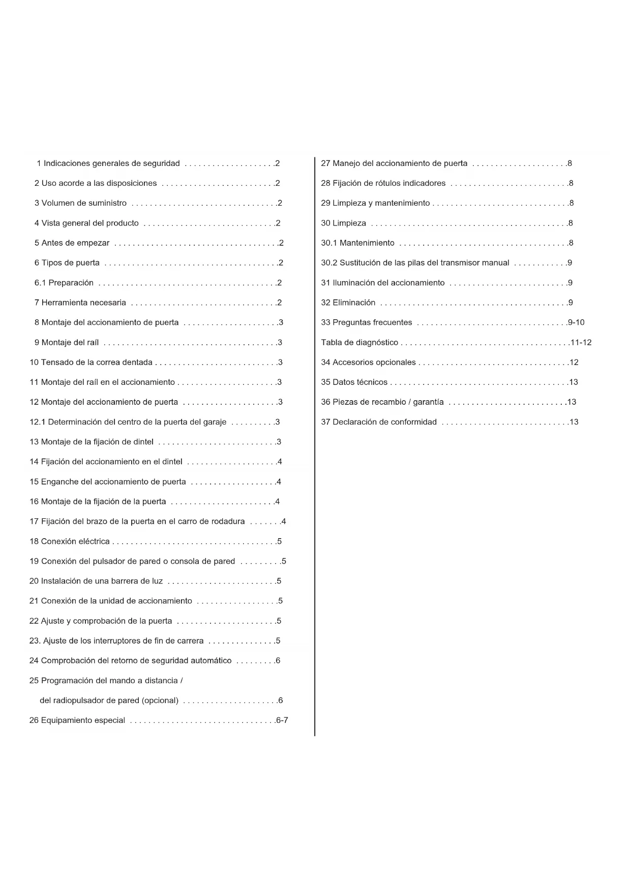 EN PRIMER LUGAR, LEA DETENIDAMENTE LAS INDICACIONES DE SEGURIDAD! PRECAUCIÓN! CUIDADO Peligro por corriente o tensión eléctrica - La puerta debe estar equilibrada. Las puertas que no se muevan o que estén agarrotadas deben ser reparadas. Las puertas de garaje, los resortes de puerta, los cables, los discos, los soportes y los raíles se encuentran bajo una tensión extrema, que puede provocar graves lesiones. No intente descargar, mover o enderezar la puerta; en su lugar, póngase en contacto con un centro de mantenimiento o un técnico de puertas.- En la instalación o el mantenimiento de un accionamiento de puerta no pueden llevarse joyas, relojes o ropa suelta.- Para evitar lesiones graves a causa de enredos, todos los cables y cadenas conectados a la puerta deben desmontarse antes de la instalación del accionamiento de puerta.- En la instalación y la conexión eléctrica deben observarse las normas de construcción y eléctricas localmente vigentes. Este dispositivo es conforme a la clase de protección 2 y no requiere una puesta a tierra.- Para evitar daños a puertas especialmente ligeras (p. ej., puertas de fibra de vidrio, aluminio o acero) debe colocarse un refuerzo adecuado. Para ello, póngase en contacto con el fabricante de la puerta.- El retorno de seguridad automático debe someterse a una comprobación. En el contacto con un obstáculo de 50 mm de altura situado en el suelo la puerta de garaje DEBE retornar. Un ajuste no adecuado del accionamiento de la puerta puede provocar graves lesiones corporales con el cierre de la puerta. Repetir la comprobación una vez al mes y, dado el caso, realizar los cambios oportunos.- Esta instalación no puede instalarse en espacios húmedos o mojados.- Durante el servicio, la puerta no puede obstaculizar bajo ninguna circunstancia vías de tránsito públicas.- Para recordar a todos los usuarios el manejo seguro, junto al pulsador de pared iluminado debe colocarse el rótulo de advertencia para la protección de niños. Los rótulos de advertencia contra el aprisionamiento deben colocarse de manera bien visible.- Los niños deben ser vigilados para garantizar que no jueguen con el aparato.- Aquellas personas (incluidos niños) con limitaciones físicas, sensoriales o psíquicas o sin la experiencia o los conocimientos suficientes sólo podrán utilizar el aparato bajo la supervisión de una persona responsable de su seguridad o habiendo recibido de esta persona las indicaciones necesarias sobre cómo utilizar el producto.- Para evitar un daño a la puerta, deben desactivarse todos los bloqueos / cierres existentes.- Los dispositivos de manejo eventualmente instalados DEBEN instalarse dentro del alcance visual de la puerta y fuera del alcance de los niños. No se debe permitir que niños manejen los pulsadores o los radiocontroles. Un uso inapropiado del accionamiento de puerta puede provocar graves lesiones.- El accionamiento de puerta SÓLO debe manejarse cuando el usuario pueda ver toda el área de la puerta, ésta esté libre de obstáculos y el accionamiento de puerta esté correctamente ajustado. Nadie puede pasar por la puerta cuando ésta se encuentre en movimiento. No se debe permitir a niños jugar cerca de la puerta. - Emplear el desbloqueo manual SÓLO con la puerta cerrada, únicamente para la separación del carro de rodadura del accionamiento y, cuando sea posible. No utilizar la empuñadura roja para abrir o cerrar la puerta.- Antes de la realización de reparaciones o de la retirada de cubiertas debe cortarse el accionamiento de puerta de la alimentación eléctrica.- Este producto posee un transformador con cable especial. En caso de daños, éste DEBE ser sustituido por un transformador original a través de técnicos competentes.- En el accionamiento del desbloqueo de emergencia pueden producirse movimientos incontrolados de la puerta cuando existen resortes débiles o rotos o cuando la puerta ya no está en equilibrio.- Colocar la empuñadura de desbloqueo para el desbloqueo de emergencia a una altura mínima de 1,8 m. Conserve este manual.Uso acorde a las disposiciones El aparato está concebido para la apertura y el cierre de puertas de garaje basculantes y seccionales en el ámbito privado. El aparato no es indicado para el uso industrial, solamente en puertas de garaje privadas concebidas para un hogar individual. Todo uso inapropiado del accionamiento entraña considerables peligros de accidente. El fabricante no asume responsabili- dad alguna por el uso inapropiado. Volumen de suministro Antes del montaje, compruebe la integridad de las piezas suministradas. Nota: La numeración sólo es de validez para el capítulo correspondiente. Vista general del producto Esta ilustración le ofrece siempre para el montaje gradual de la instalación una vista general completa sobre la instalación montada. Resumen de piezas (cabeza de accionamiento):