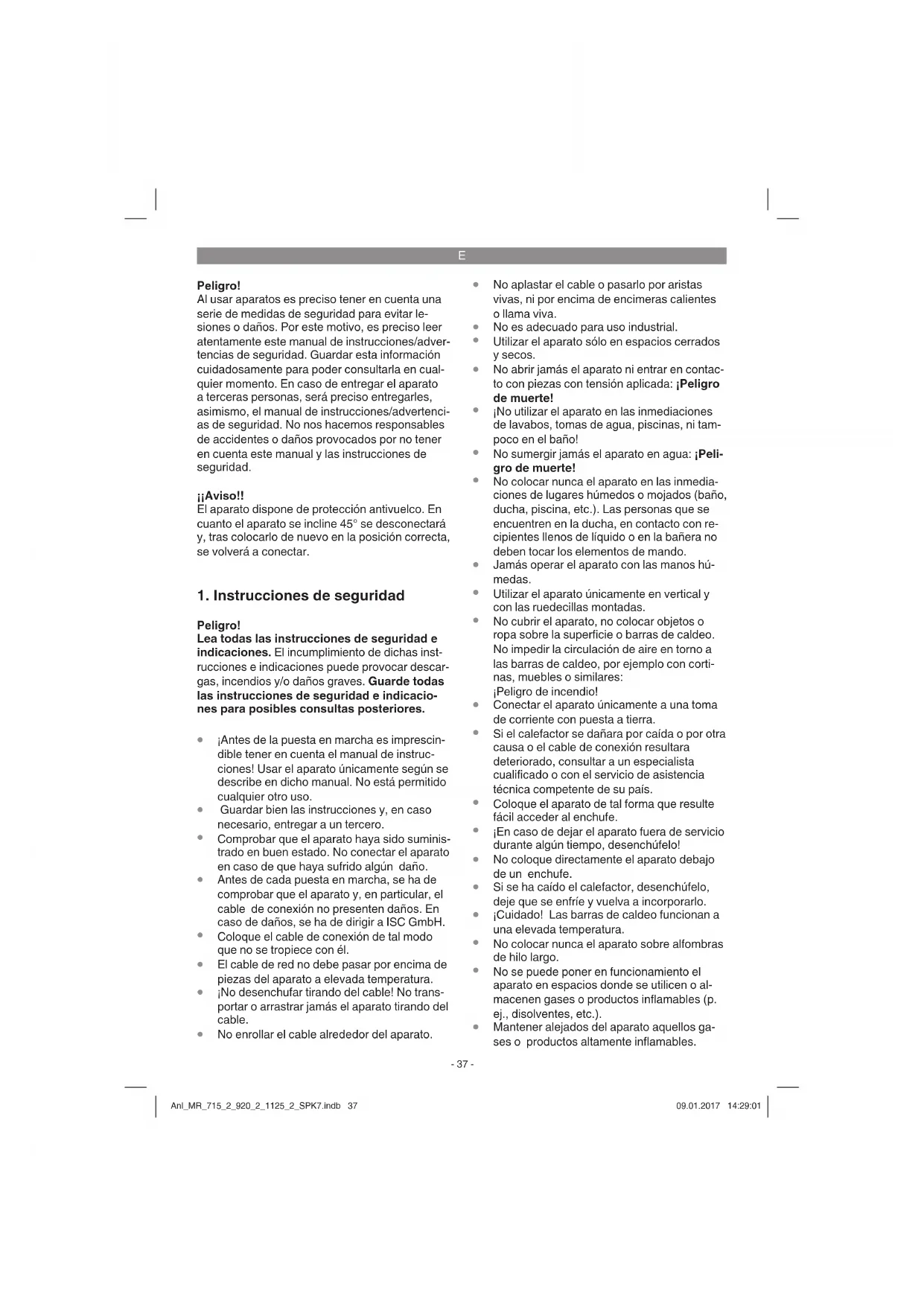 Peligro! Al usar aparatos es preciso tener en cuenta una serie de medidas de seguridad para evitar le- siones o daños. Por este motivo, es preciso leer atentamente este manual de instrucciones/adver- tencias de seguridad. Guardar esta información cuidadosamente para poder consultarla en cual- quier momento. En caso de entregar el aparato a terceras personas, será preciso entregarles, asimismo, el manual de instrucciones/advertenci- as de seguridad. No nos hacemos responsables de accidentes o daños provocados por no tener en cuenta este manual y las instrucciones de seguridad. ¡¡Aviso!! El aparato dispone de protección antivuelco. En cuanto el aparato se incline 45° se desconectará y, tras colocarlo de nuevo en la posición correcta, se volverá a conectar.