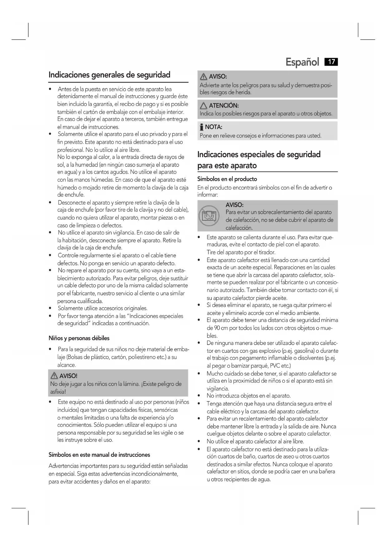 - Esteequiponoestádestinadoalusoporpersonas(niños incluidos) que tengan capacidades físicas, sensóricas o mentales limitadas o una falta de experiencia y/o conocimientos. Sólo pueden utilizar el equipo si una persona responsable por su seguridad se les vigile o se les instruye sobre el uso. Símbolos en este manual de instrucciones Advertenciasimportantesparasuseguridadestánseñaladas en especial. Siga estas advertencias incondicionalmente, paraevitaraccidentesydañosenelaparato: AVISO: Advierte ante los peligros para su salud y demuestra posi- bles riesgos de herida. ATENCIÓN: Indica los posibles riesgos para el aparato u otros objetos. NOTA: Pone en relieve consejos e informaciones para usted. Indicaciones especiales de seguridad para este aparato Símbolos en el producto En el producto encontrará símbolos con el fin de advertir o informar: AVISO: Para evitar un sobrecalentamiento del aparato de calefacción, no se debe cubrir el aparato de calefacción.