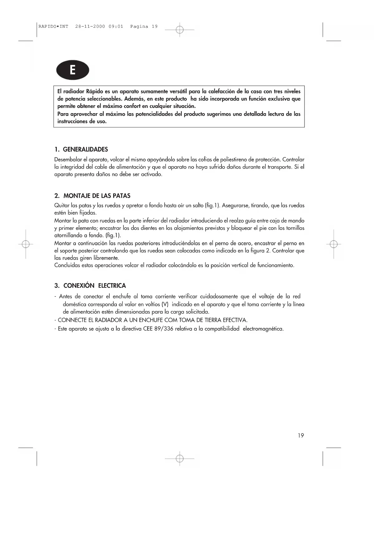 RAPIDO•INT 28-11-2000 09:01 Pagina 1819 El radiador Rápido es un aparato sumamente versátil para la calefacción de la casa con tres niveles de potencia seleccionables. Además, en este producto ha sido incorporada un función exclusiva que permite obtener el máximo confort en cualquier situación. Para aprovechar al máximo las potencialidades del producto sugerimos una detallada lectura de las instrucciones de uso.