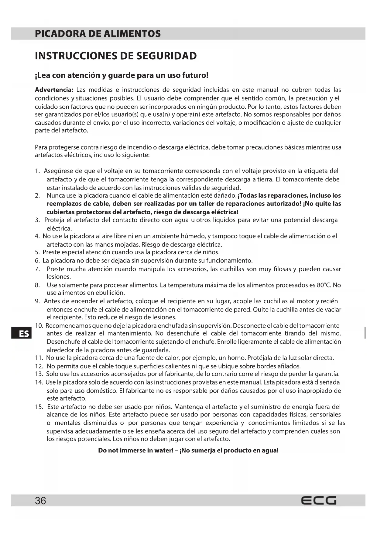 - Use la picadora solo de acuerdo con las instrucciones provistas en este manual.Esta picadora está disnada solo para uso domestico. El fabricante no es responsable por daños causados por el uso inappropriado de este artefacto.