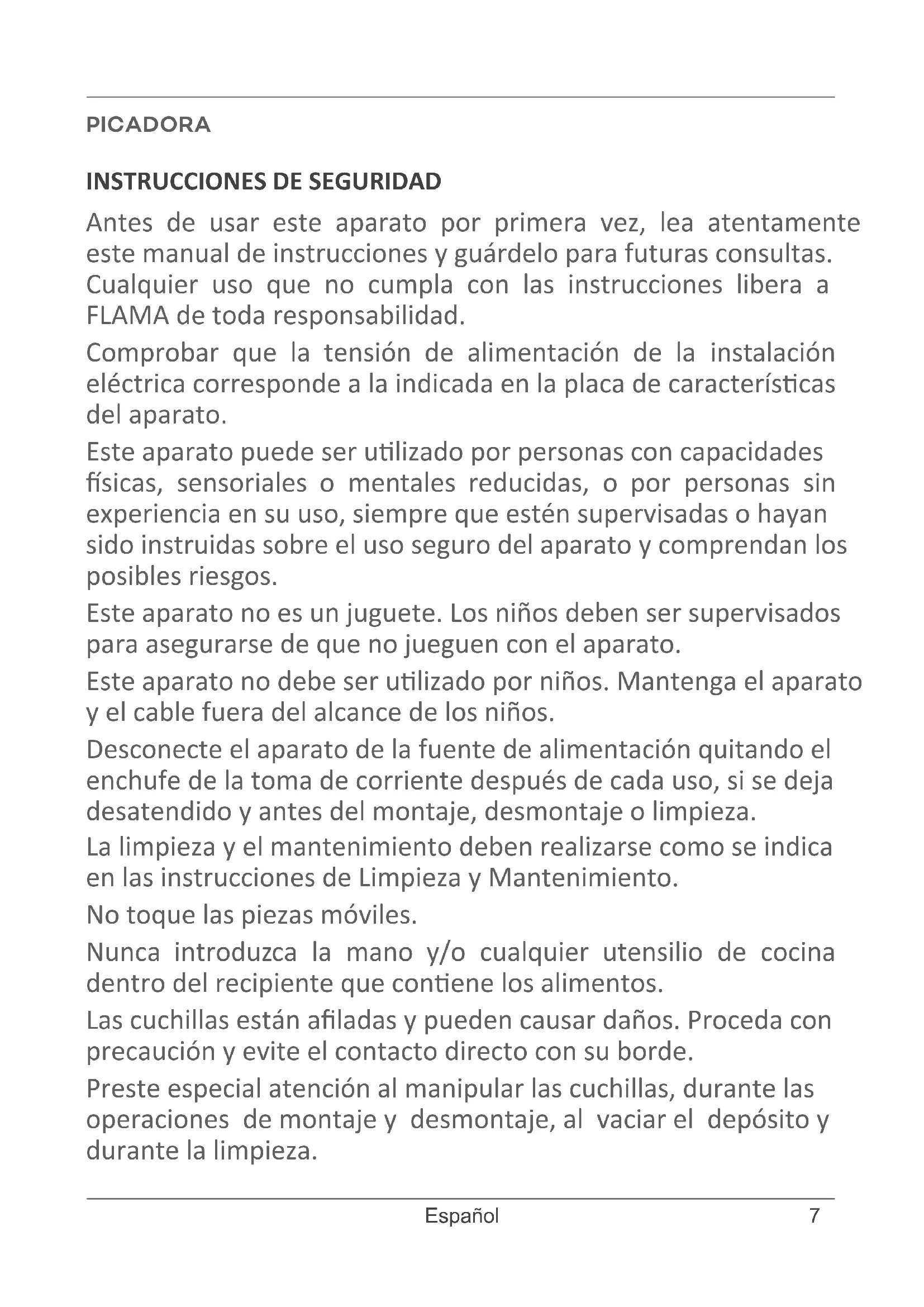 Antes de usar este aparato por primera vez, lea atentamente este manual de instrucciones y guardelo para futuras consultas. Cualquier uso que no cumpla con las instrucciones libera a FLAMA de toda responsabilidad.