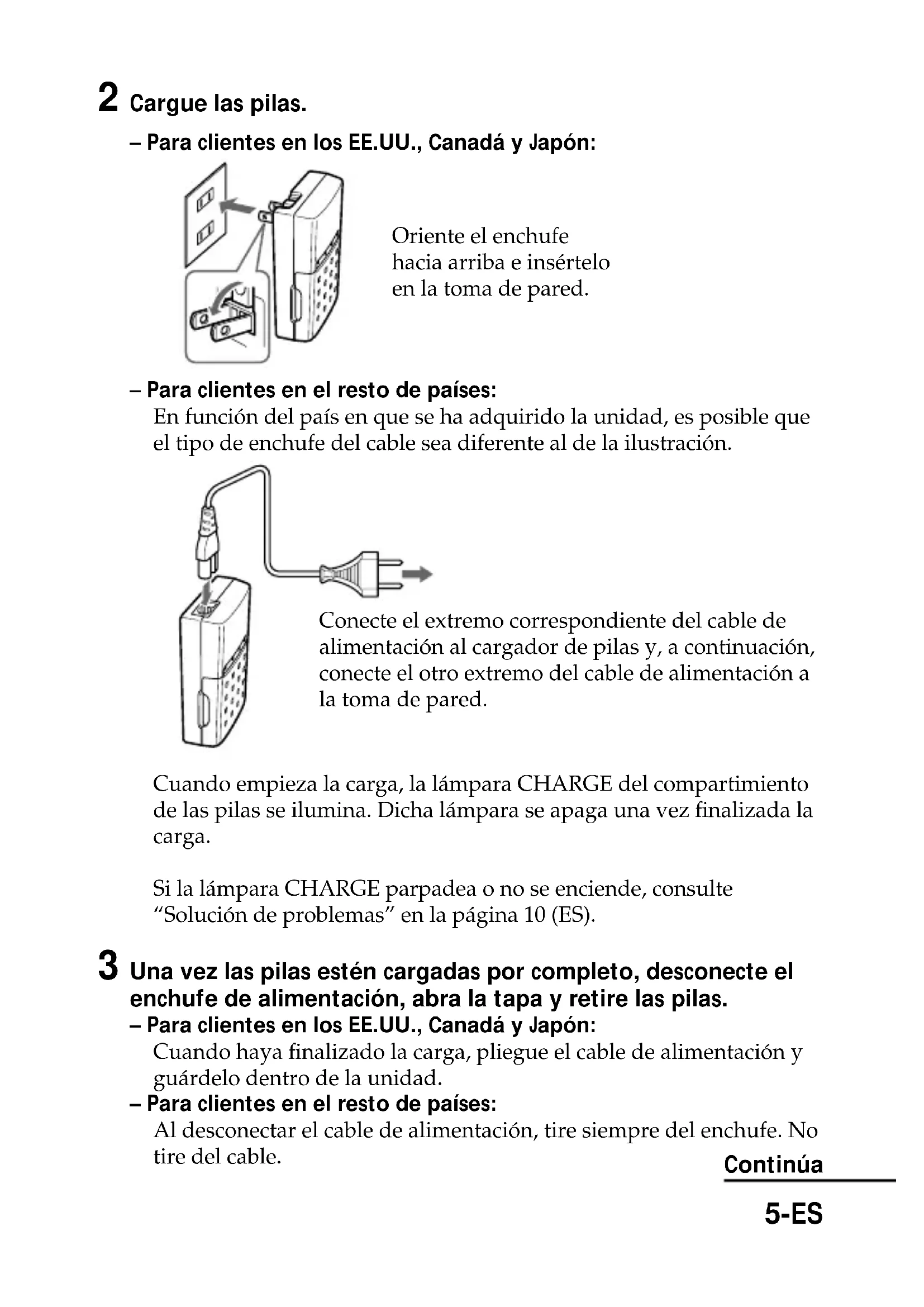 - En este documento, la palabra “pilas” se refiere a baterías recargables. Identificación de piezas ....................................................................................... 4 Carga de las pilas .................................................................................................. 4 Precauciones .......................................................................................................... 6 Utilización de pilas de hidruro de níquel metálico ......................................... 9 Solución de problemas....................................................................................... 10 Especificaciones .................................................................................................. 115-ES 2 Cargue las pilas. – Para clientes en los EE.UU., Canadá y Japón: – Para clientes en el resto de países: En función del país en que se ha adquirido la unidad, es posible que el tipo de enchufe del cable sea diferente al de la ilustración. Cuando empieza la carga, la lámpara CHARGE del compartimiento de las pilas se ilumina. Dicha lámpara se apaga una vez finalizada la carga. Si la lámpara CHARGE parpadea o no se enciende, consulte “Solución de problemas” en la página 10 (ES). 3 Una vez las pilas estén cargadas por completo, desconecte el enchufe de alimentación, abra la tapa y retire las pilas. – Para clientes en los EE.UU., Canadá y Japón: Cuando haya finalizado la carga, pliegue el cable de alimentación y guárdelo dentro de la unidad. – Para clientes en el resto de países: Al desconectar el cable de alimentación, tire siempre del enchufe. No tire del cable. Continúa Conecte el extremo correspondiente del cable de alimentación al cargador de pilas y, a continuación, conecte el otro extremo del cable de alimentación a la toma de pared. Oriente el enchufe hacia arriba e insértelo en la toma de pared.6-ES Precauciones