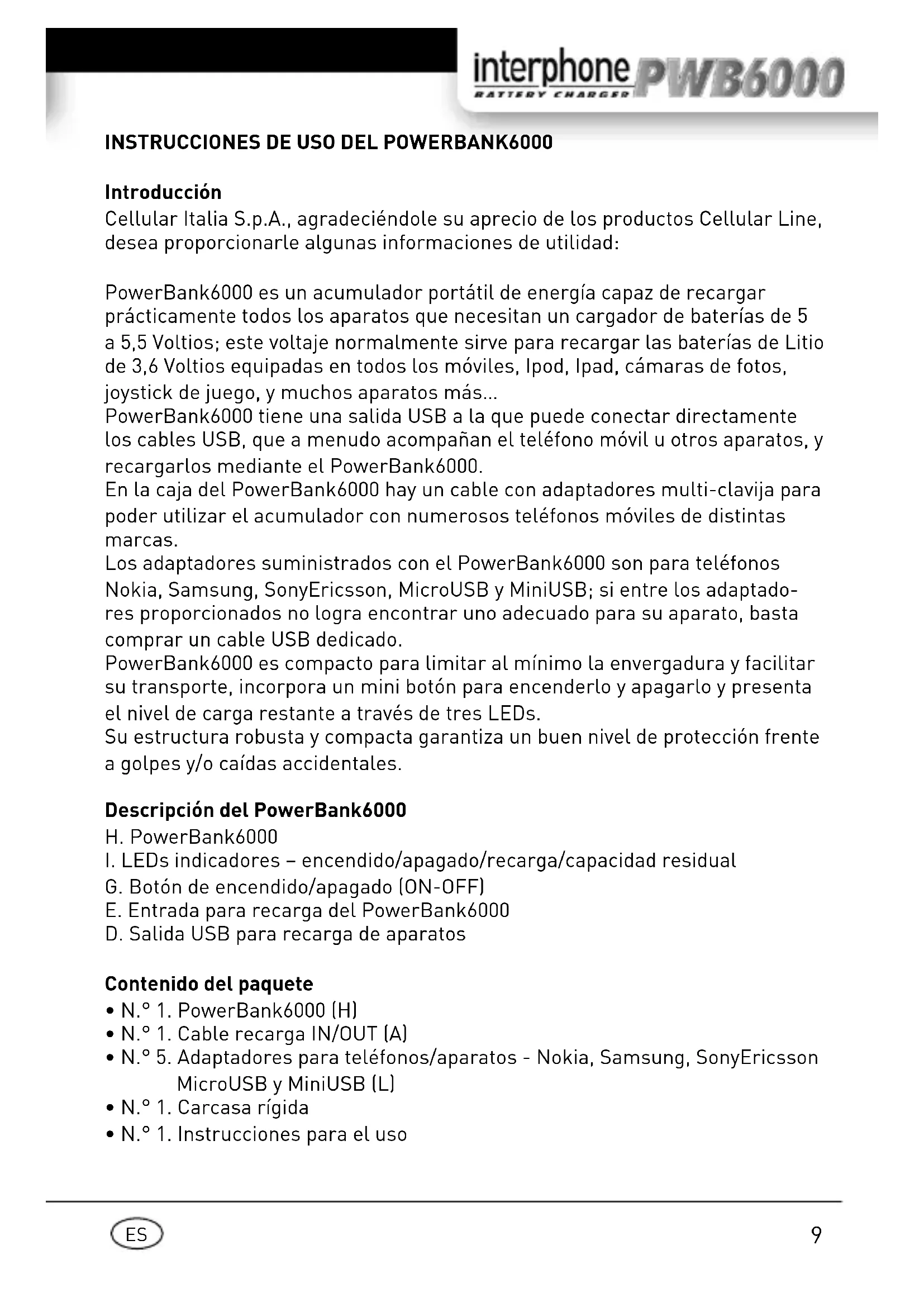 Interphone PWB6000 - Batería portátil Cellular Line - Manual de uso y guía de instrucciones gratis