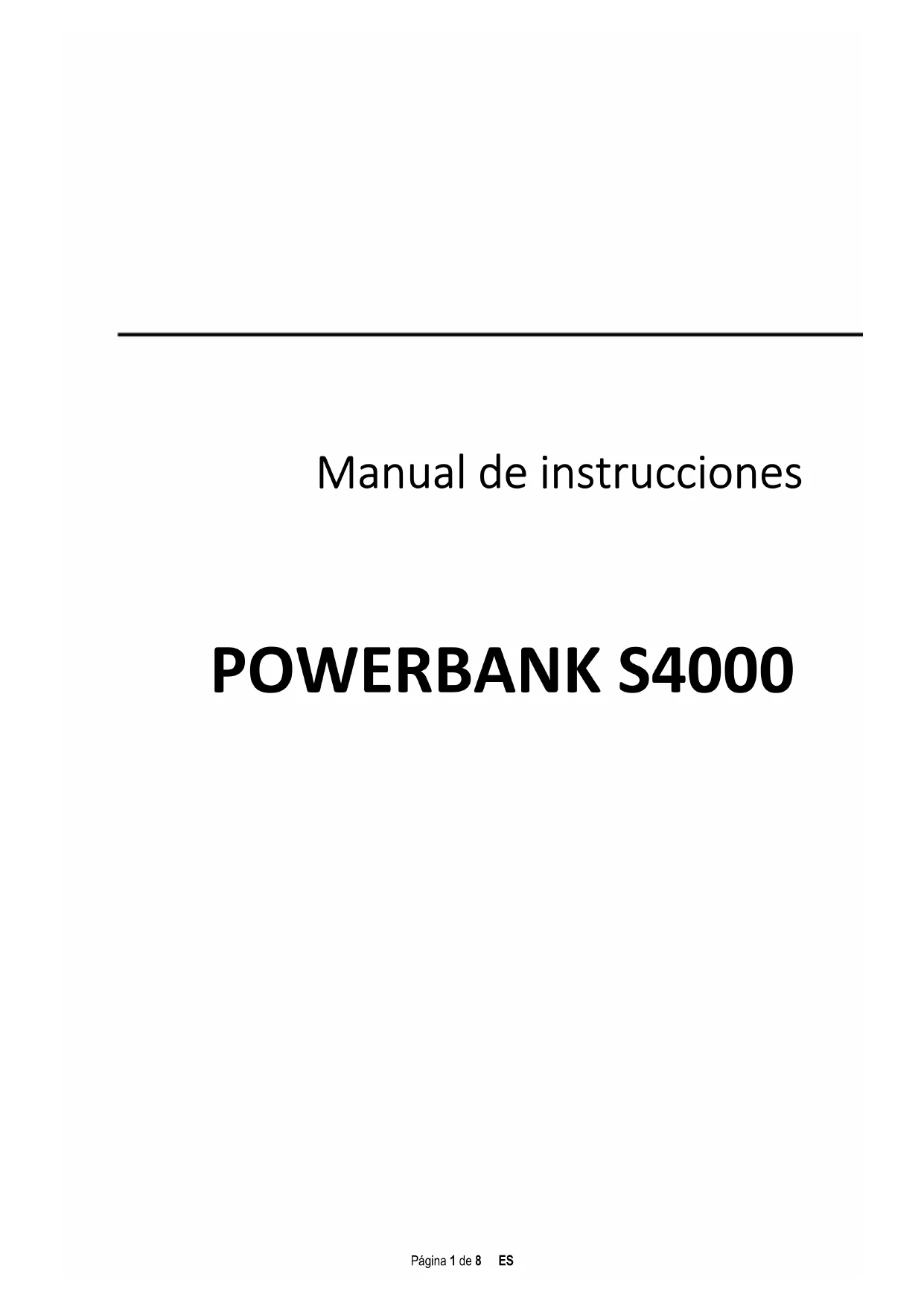 POWERBANK S4000Página 2 de 8 ES Sobre este manual Lea este manual cuidadosamente y observe, lea y siga todas las instrucciones mencionadas aquí para asegurar la larga vida y el uso confiable de este aparato. Por favor tenga a mano este manual para referencia futura y páselo a otros usuarios de este artefacto. Uso correcto Este Powerbank debe utilizarse exclusivamente para suministrar energía a dispositivos con una tensión de servicio de 5 V de corriente continua (teléfonos móviles, reproductores MP3, etc.). Cualquier otro uso se considera incorrecto y puede causar daños y lesiones. Queda excluida cualquier tipo de reclamación por daños resultantes del uso inapropiado. Para evitar errores de funcionamiento, no conecte la toma USB del dispositivo Powerbank a los puertos USB de ordenadores u otros aparatos. Está diseñado únicamente para cargar. No desmonte el dispositivo y no trate de repararlo. No contiene piezas que puedan ser reparadas por el usuario y la garantía quedaría automáticamente anulada. No introduzca ningún elemento que no esté especialmente diseñado para ello en ninguna de las ranuras de este producto. Hay riesgo de cortocircuito. No maneje el dispositivo con las manos mojadas. No limpie el aparato con agua o productos químicos. Use solo un trapo seco. Es normal que el dispositivo se caliente con el uso. No lo cubra mientras lo esté utilizando. No use el aparato en caso de que esté visiblemente dañado o húmedo.