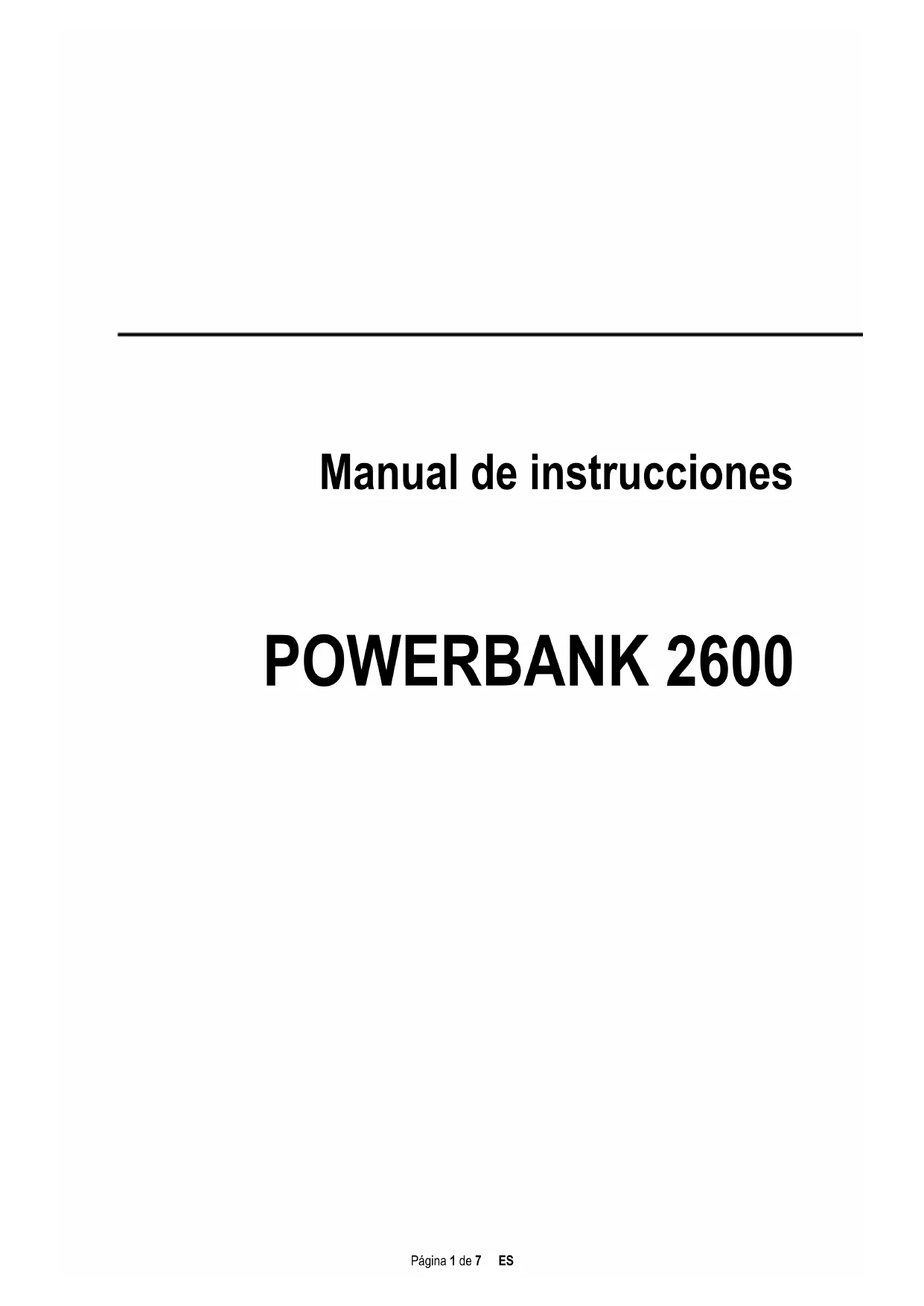 POWERBANK 2600Página 2 de 7 ES Amplitud de entrega Intenso Powerbank 2600 Micro USB - Cable de carga Instrucciones operativas Datos técnicos Dimensiones: 70 x 33 x 22 mm Consumo máximo de energía (Entrada): 5V 0.5A / 1 A Salida de corriente de carga máxima (Salida): 1 A Batería interna: Batería de litio-ión de 2600 mAh Pantalla de estatus: 4 luces LED Protección de descarga y sobrecarga incluida