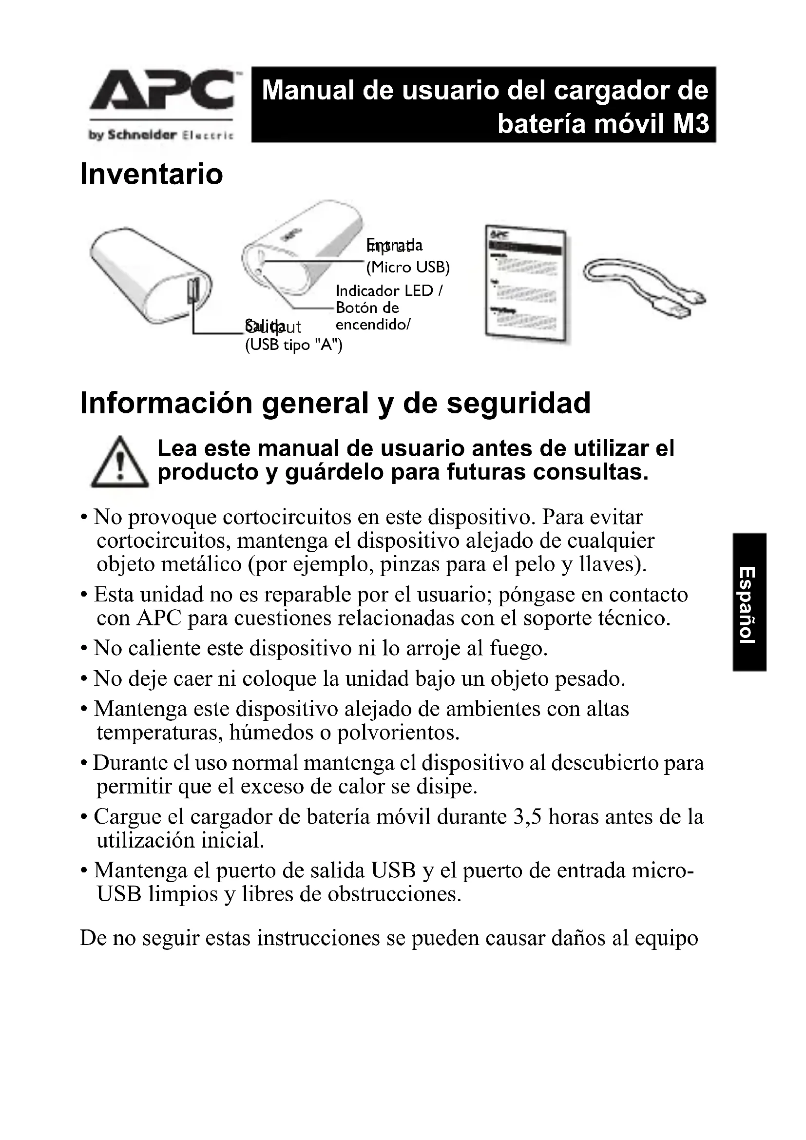 F)© 2015 APC by Schneider Electric. APC y el logotipo de APC son propiedad de Schneider Electric Industries S.A.S o sus empresas afiliadas. Todas las demás marcas comerciales son propiedad de sus respectivos titulares. ES 990-5593 01/2015 Español Resolución de problemas Servicio Mundial de Atención al Cliente de APC by Schneider Electric IT Para asistencia al cliente específica del país, diríjase al sitio Web de APC by Schneider Electric www.apc.com. Problema/posible causa Solución El cargador de batería móvil no se puede cargar. El cargador USB podría estar averiado o el equipo informático podría estar en el modo de suspensión. Intente utilizar otro cargador USB o reanude el equipo informático desde el modo de suspensión. El cable micro USB y los contactos del conector se han desgastado. Intente utilizar un nuevo conector micro USB. El cargador de batería móvil no puede cargar algunos dispositivos. Es posible que el cargador de batería no haya sido capaz de reconocer y detectar los dispositivos conectados a él. Algunos cables USB disponibles en el mercado podrían no funcionar de forma correcta con el cargador de batería M3. Para resolver este problema, presione el botón de encendido/apagado del cargador de batería M3 para iniciar la carga del dispositivo. Si la batería continúa sin cargar su dispositivo, reemplace el cable de reemplazo por el cable original suministrado con el dispositivo. Se produjo una condición de sobrecarga y parpadea el indicador LED naranja del cargador de batería M3. El cargador de batería M3 está cargando un dispositivo y su corriente de salida USB excede el rango especificado. Extraiga el dispositivo que se está cargando del cargador de batería M3. La vida del cargador de batería móvil ha caducado o se ha producido una avería en el mismo. En el caso de un fallo del sistema, contacte con su distribuidor APC de Schneider Electric o con la agencia de servicios autorizada APC de Schneider Electric.українська мова