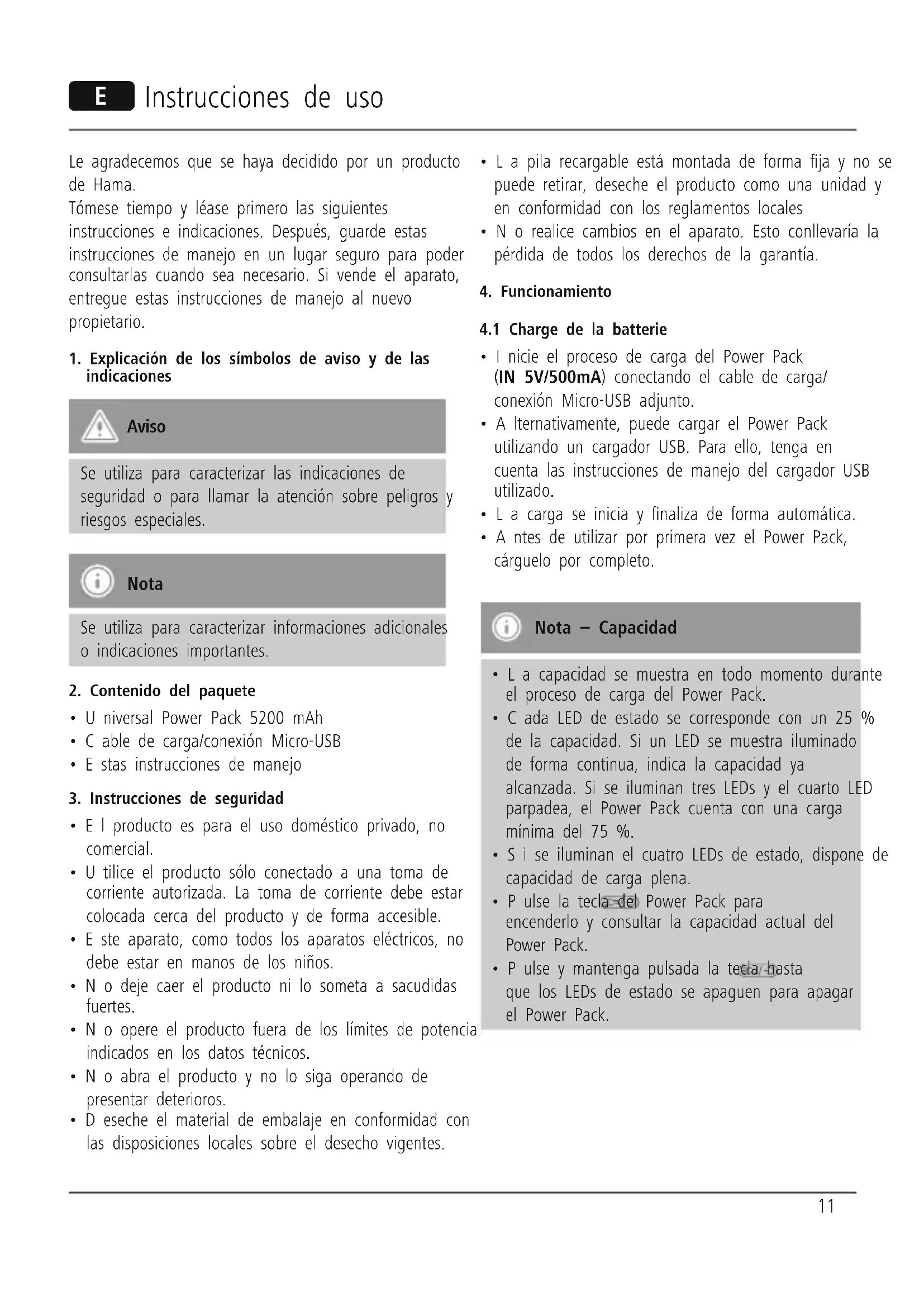 Consumo de corriente máx. 500 mA Tensión del Power Pack 5 V DC Indicación de capacidad : 5200 mAh min. capacidad : 5000 mAh Salida de corriente máx. 2100 mA Rango de temperatura0°C – 45 °C Tipo de pila Polímero de ion