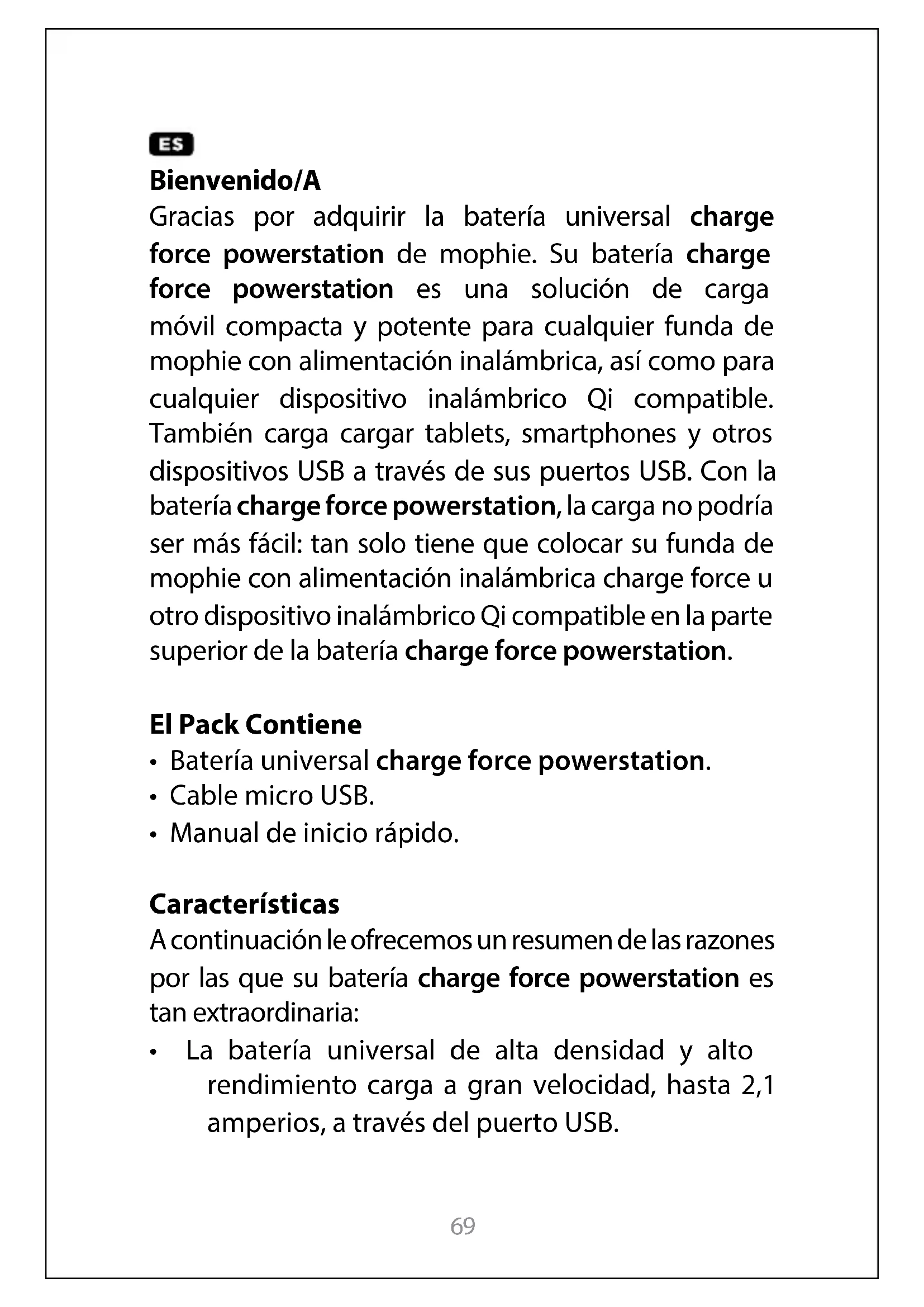 Gracias por adquirir la batería universal charge force powerstation de mophie. Su batería charge force powerstation es una solución de carga móvil compacta y potente para cualquier funda de mophie con alimentación inalámbrica, así como para cualquier dispositivo inalámbrico Qi compatible. También carga cargar tablets, smartphones y otros dispositivos USB a través de sus puertos USB. Con la batería charge force powerstation, la carga no podría ser más fácil: tan solo tiene que colocar su funda de mophie con alimentación inalámbrica charge force u otro dispositivo inalámbrico Qi compatible en la parte superior de la batería charge force powerstation.