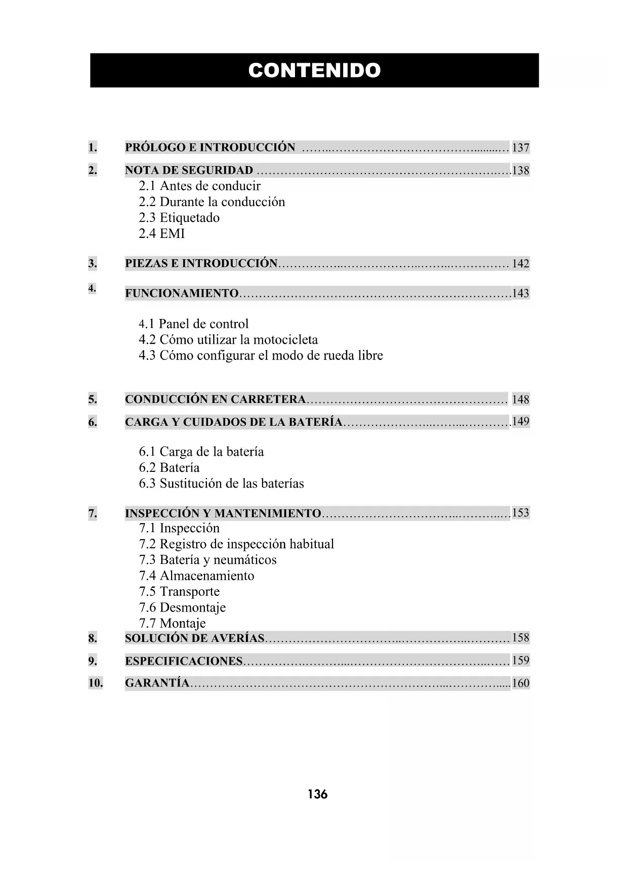 CONTENIDO137 Lea detenidamente este manual del propietario antes de utilizar el vehículo. El uso inadecuado del vehículo podría provocar daños, lesiones o accidentes de tráfico. Para sacar el máximo partido a su motocicleta, lea el manual del propietario antes de utilizarla. Este manual de usuario incluye instrucciones de funcionamiento de cada uno de los aspectos del vehículo, instrucciones de montaje e instrucciones sobre cómo enfrentarse a posibles accidentes.
