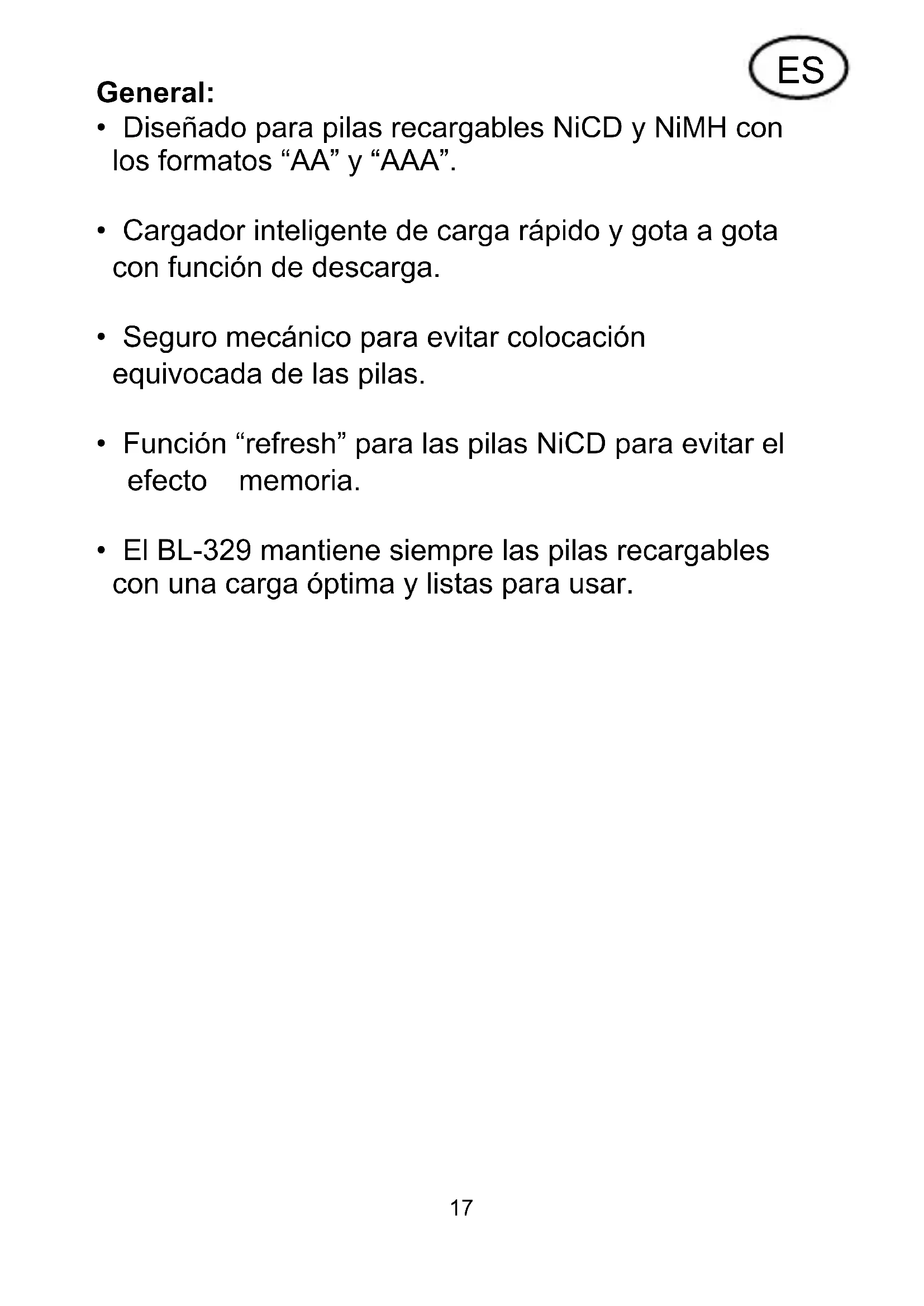 - El BL-329 mantiene siempre las pilas recargables con una carga óptima y listas para usar. ES18 Uso: