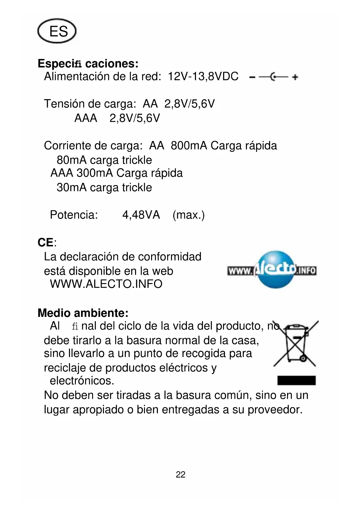 Corriente de carga: AA 800mA Carga rápida 80mA carga trickle AAA 300mA Carga rápida 30mA carga trickle Potencia: 4,48VA (max.) CE: La declaración de conformidad está disponible en la web