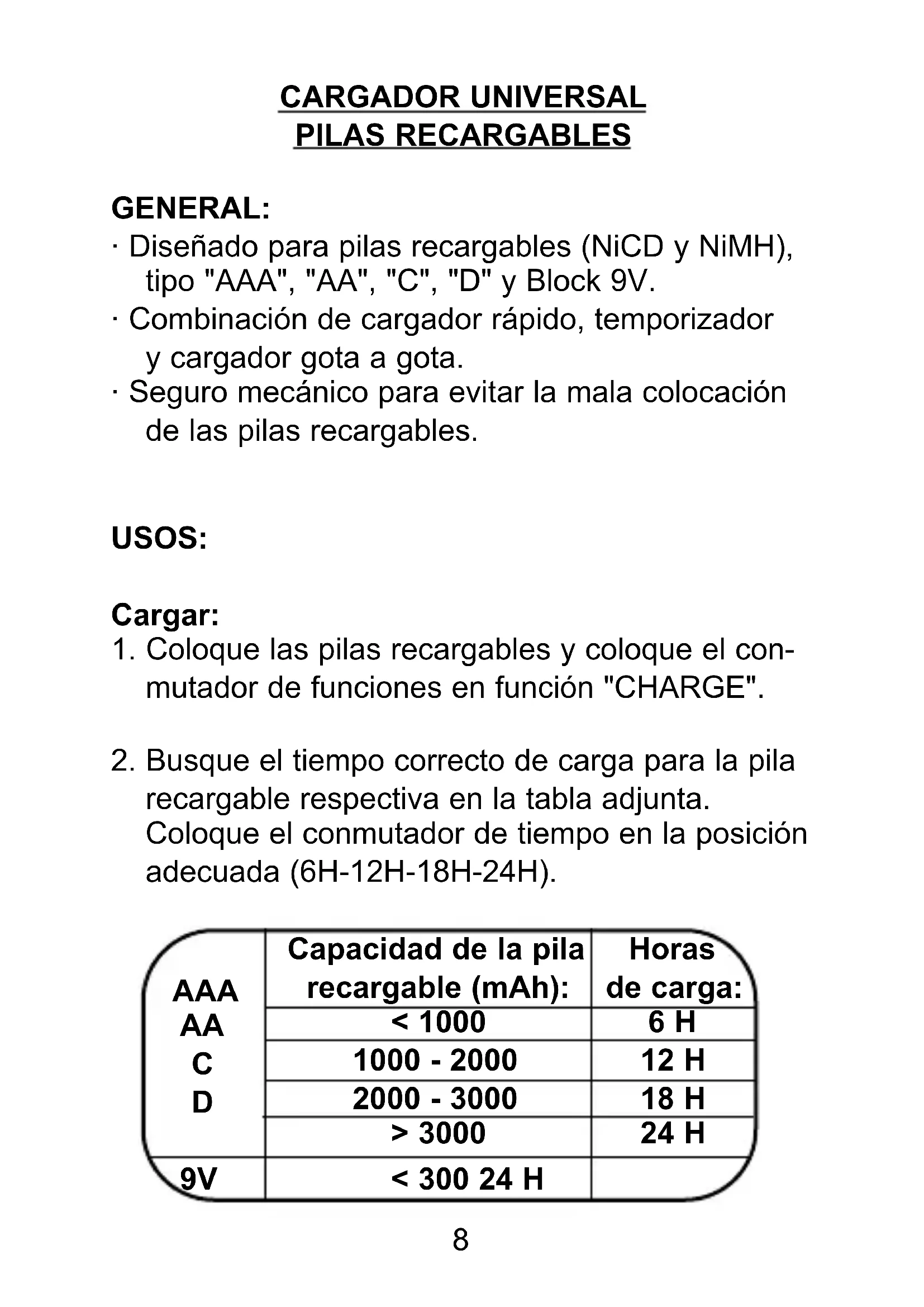 - Seguro mecánico para evitar la mala colocación de las pilas recargables. USOS: Cargar: