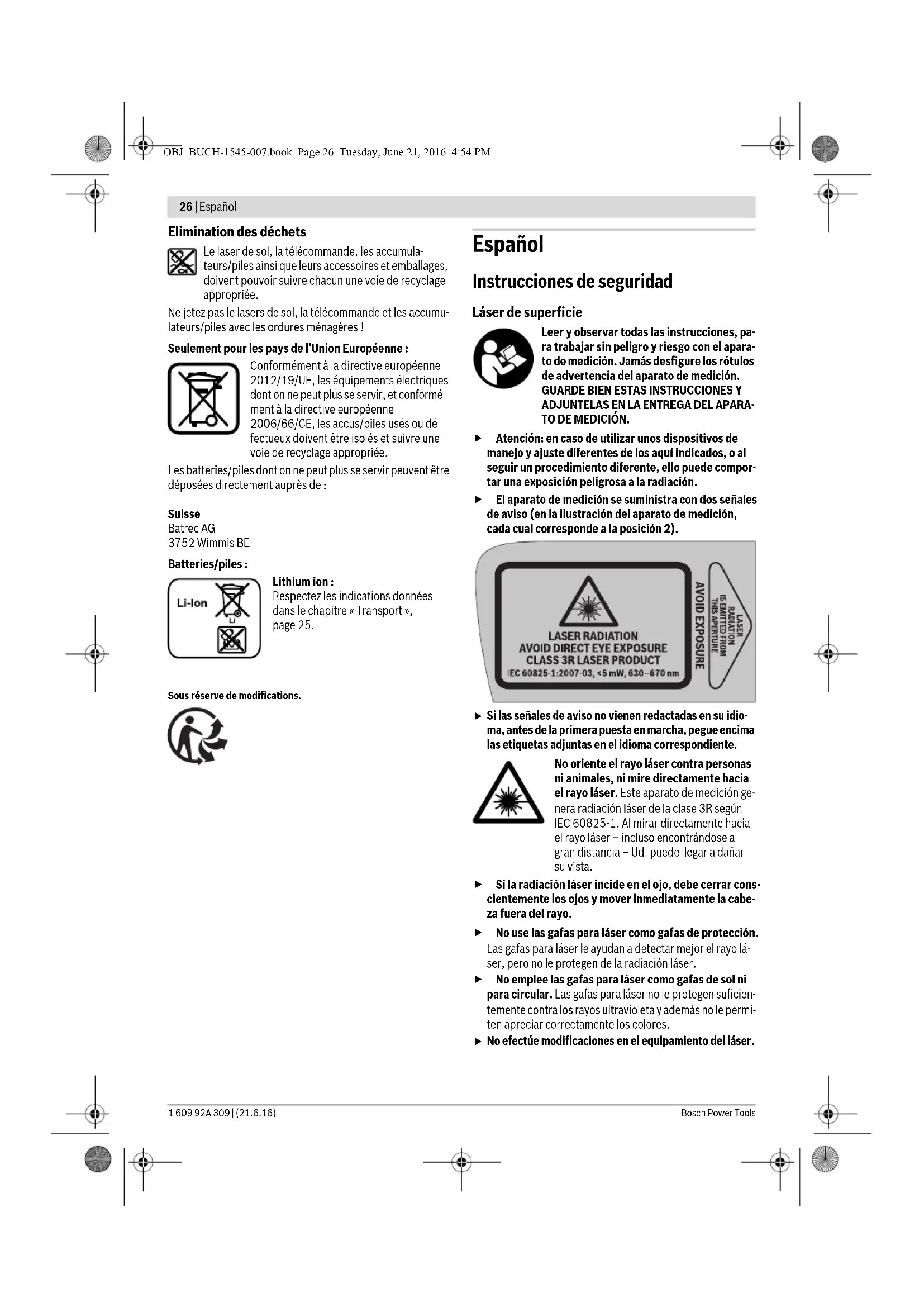 No efectúe modificaciones en el equipamiento del láser. OBJ_BUCH-1545-007.book Page 26 Tuesday, June 21, 2016 4:54 PMEspañol | 27 Bosch Power Tools 1 609 92A 309 | (21.6.16) Únicamente haga reparar su aparato de medición por un profesional, empleando exclusivamente piezas de repuesto originales. Solamente así se mantiene la seguri- dad del aparato de medición. Evite la reflexión del rayo láser sobre superficies lisas como cristales o espejos. También un rayo láser reflejado puede llegar a dañar su vista. El aparato de medición solamente deberá ser emplea- do por aquellas personas que estén familiarizadas con el manejo de aparatos láser. Según EN 60825-1 ello im- plica además disponer de los conocimientos necesarios concernientes al efecto biológico del láser sobre el ojo y la piel, así como la correcta protección contra radiación láser como medida para la prevención de peligros. No utilice el aparato de medición en un entorno con pe- ligro de explosión, en el que se encuentren combusti- bles líquidos, gases o material en polvo. El aparato de medición puede producir chispas e inflamar los materiales en polvo o vapores. Siempre coloque el aparato de medición de manera que los rayos láser sean proyectados a una altura muy por encima o muy por debajo de sus ojos. De esta forma se asegura que sus ojos no puedan dañarse. Identifique el área de utilización del aparato de medi- ción con unas señales de peligro por radiación láser. De esta manera evita Ud. que personas ajenas a los traba- jos accedan al área de peligro. No guarde el aparato de medición en lugares accesibles a personas no autorizadas. Las personas que no estén familiarizadas con el uso del aparato de medición pueden dañarse a sí mismo o a otras personas. Tenga en cuenta las prescripciones de uso que pudie- ran existir en su país para aparatos de medición dota- dos con un láser de la clase 3R. El incumplimiento de estas prescripciones podría acarrear lesiones. Cuide que esté vigilada o apantallada el área expuesta a la radiación láser. Si se mantiene controlada el área con radiación láser se evita que pueda ser dañada la vista de personas no involucradas en los trabajos. Desmonte el acumulador o las pilas antes de manipular en el aparato de medición (p.ej. al montarlo, en el man- tenimiento, etc.), así como al transportarlo y guardar- lo. En caso contrario podría accidentarse al accionar for- tuitamente el interruptor de conexión/desconexión. No abra el acumulador. De lo contrario, podría producir- se un cortocircuito. Proteja el acumulador del calor excesivo como, p. ej., de una exposición prolongada al sol, del fuego, del agua y de la humedad. Existe el riesgo de explosión. Si no utiliza el acumulador, guárdelo separado de clips, monedas, llaves, clavos, tornillos o demás objetos me- tálicos que pudieran puentear sus contactos. El corto- circuito de los contactos del acumulador puede causar quemaduras o un incendio.