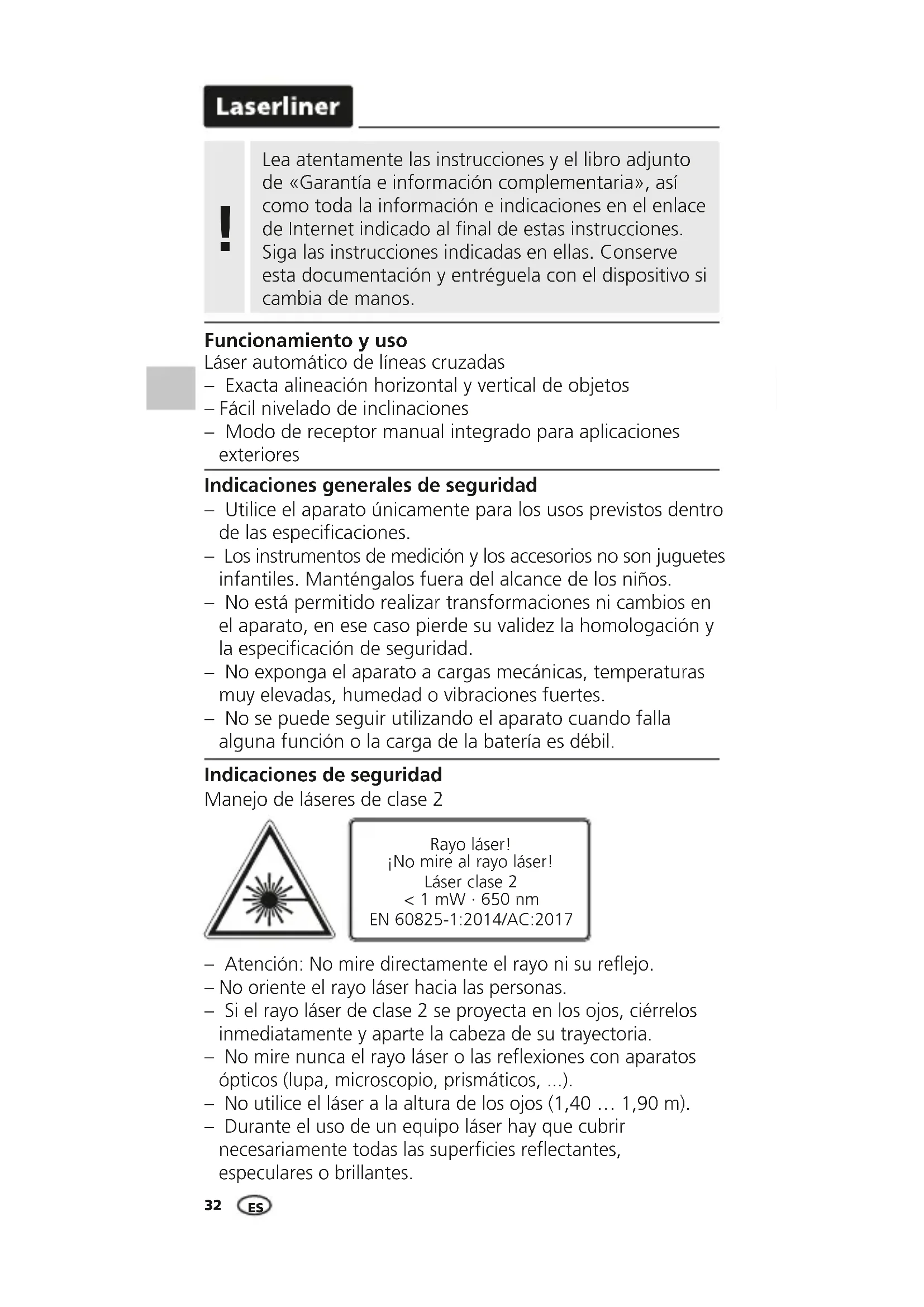 Funcionamiento y uso Láser automático de líneas cruzadas – Exacta alineación horizontal y vertical de objetos – Fácil nivelado de inclinaciones – Modo de receptor manual integrado para aplicaciones exteriores Indicaciones generales de seguridad – Utilice el aparato únicamente para los usos previstos dentro de las especicaciones. – Los instrumentos de medición y los accesorios no son juguetes infantiles. Manténgalos fuera del alcance de los niños. – No está permitido realizar transformaciones ni cambios en el aparato, en ese caso pierde su validez la homologación y la especicación de seguridad. – No exponga el aparato a cargas mecánicas, temperaturas muy elevadas, humedad o vibraciones fuertes. – No se puede seguir utilizando el aparato cuando falla alguna función o la carga de la batería es débil. Rayo láser! ¡No mire al rayo láser! Láser clase 2 < 1 mW · 650 nm EN 60825-1:2014/AC:2017 Indicaciones de seguridad Manejo de láseres de clase 2 – Atención: No mire directamente el rayo ni su reejo. – No oriente el rayo láser hacia las personas. – Si el rayo láser de clase 2 se proyecta en los ojos, ciérrelos inmediatamente y aparte la cabeza de su trayectoria. – No mire nunca el rayo láser o las reexiones con aparatos ópticos (lupa, microscopio, prismáticos, ...). – No utilice el láser a la altura de los ojos (1,40 … 1,90 m). – Durante el uso de un equipo láser hay que cubrir necesariamente todas las supercies reectantes, especulares o brillantes. ESSmartCross-Laser