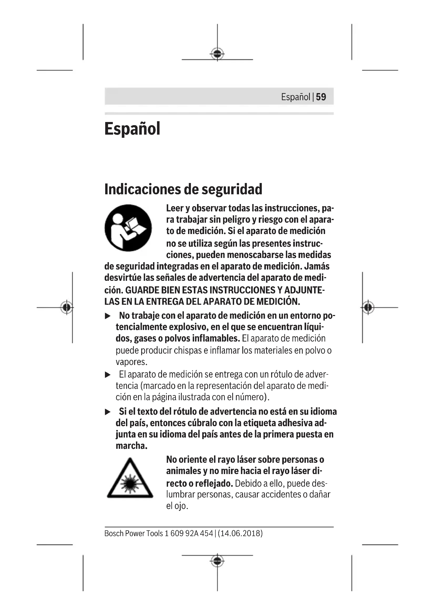 en función del tipo de superficie y las condiciones del entorno Telémetro láser digital Colocar/cambiar las pilas Para el funcionamiento de la herramienta de medición se reco- miendan pilas alcalinas de manganeso. – Coloque las pilas (véase la figura en la página 4). Observe en ello la polaridad correcta conforme a la representación en el lado interior del compartimiento de pilas. Al disminuir la tensión de las pilas se indica la advertencia de pila (a) en el visualizador. En el caso de aparecer el símbolo de pila por primera vez en el visualizador, se pueden realizar mediciones aún durante aprox. 15 minutos. Cuando el símbolo de pila parpadea, se tie- nen que cambiar las pilas; ya no se pueden realizar medicio- nes. Español | 65 Bosch Power Tools 1 609 92A 454 | (14.06.2018)66 | Español 1 609 92A 454 | (14.06.2018) Bosch Power Tools Reemplace siempre simultáneamente todas las pilas. Utilice sólo pilas de un fabricante y con igual capacidad. u No use acumuladores o pilas de iones de litio. El aparato de medición se puede dañar. Operación Conexión/desconexión del telémetro láser – Para conectar el aparato de medición, oprima por un tiem- po breve la tecla de medición (1). Al conectar el aparato de medición se conecta el rayo láser. La indicación parpadea en el visualizador. – Para desconectar el aparato de medición mantenga pulsa- da la tecla de medición (1). Proceso de medición Tras la conexión del aparato de medición tiene lugar una medi- ción continua. El valor de medición actual (g) se indica en la lí- nea inferior del visualizador (véase la figura A). Durante la me- dición continua, se puede mover el aparato de medición con respecto al objetivo, en lo cual se actualiza el valor de medi- ción actual (g) aprox. cada 0,5 segundos en la línea inferior del visualizador (véase la figura B). La indicación parpadea en el visualizador. El plano de referencia para la medición es el borde trasero del aparato de medición ( ). (ver figura C) Medición de longitud – Presione la tecla de medición (1) para detener el proceso de medición. El rayo láser se desconecta y se indica el valor de medición actual (g). – Presione de nuevo la tecla de medición (1), para conectar de nuevo el láser y continuar la medición. El valor de medi- ción actual (g) se indica en la línea inferior del visualizador y el valor de medición precedente (e) sobre esta última.Medición de superficie – Presione la tecla de medición (1) dos veces rápidamente para multiplicar los dos últimos valores de medición (ver fi- gura D). En el visualizador aparece la indicación , se indi- ca el valor de superficie. Presione de nuevo la tecla de medición (1) dos veces rápi- damente para llegar a la indicación de los dos últimos valo- res de medición. Si no se presiona ninguna tecla del aparato de medición duran- te aprox. 5 minutos, el aparato de medición se apaga automá- ticamente para proteger las pilas. u No oriente el rayo láser contra personas ni animales, ni mire directamente hacia el rayo láser, incluso encon- trándose a gran distancia. Instrucciones para la operación Indicaciones generales El lente de recepción (7) y la salida de la radiación láser (8) no deben estar cubiertos durante una medición. La medición se efectúa en el centro del haz, también en el caso de proyectar oblicuamente el haz. Fallos - Causas y remedio Causa Remedio La advertencia de temperatura (b) parpadea, indicación "err", no es posible realizar la medición, el aparato de me- dición se desconecta automáticamente tras 5 segundos El aparato de medición se en- cuentra fuera de la temperatu- ra de servicio de – 10 °C has- ta +40 °C. Espere hasta que el aparato de medición alcance la tempe- ratura de servicio. Luego vuel- va a encender el aparato de medición. Español | 67 Bosch Power Tools 1 609 92A 454 | (14.06.2018)68 | Español 1 609 92A 454 | (14.06.2018) Bosch Power Tools Causa Remedio Todos los símbolos parpadean; no es posible realizar la medición Herramienta de medición de- fectuosa Verifique las pilas y reemplá- celas si es necesario. Adaptador montado ((c)) parpadea, indicación "err", no es posible realizar la medición Fallo del adaptador: – Adaptador defectuoso Envíe el adaptador al servicio de atención al cliente. – El adaptador no tiene co- nexión con el aparato de medición Limpie los contactos. Si el adaptador todavía aún no establece una conexión con el aparato de medición, envíe el adaptador al servicio de aten- ción al cliente. Indicación "----", no es posi- ble realizar la medición Margen de medición sobrepa- sado (20 m)