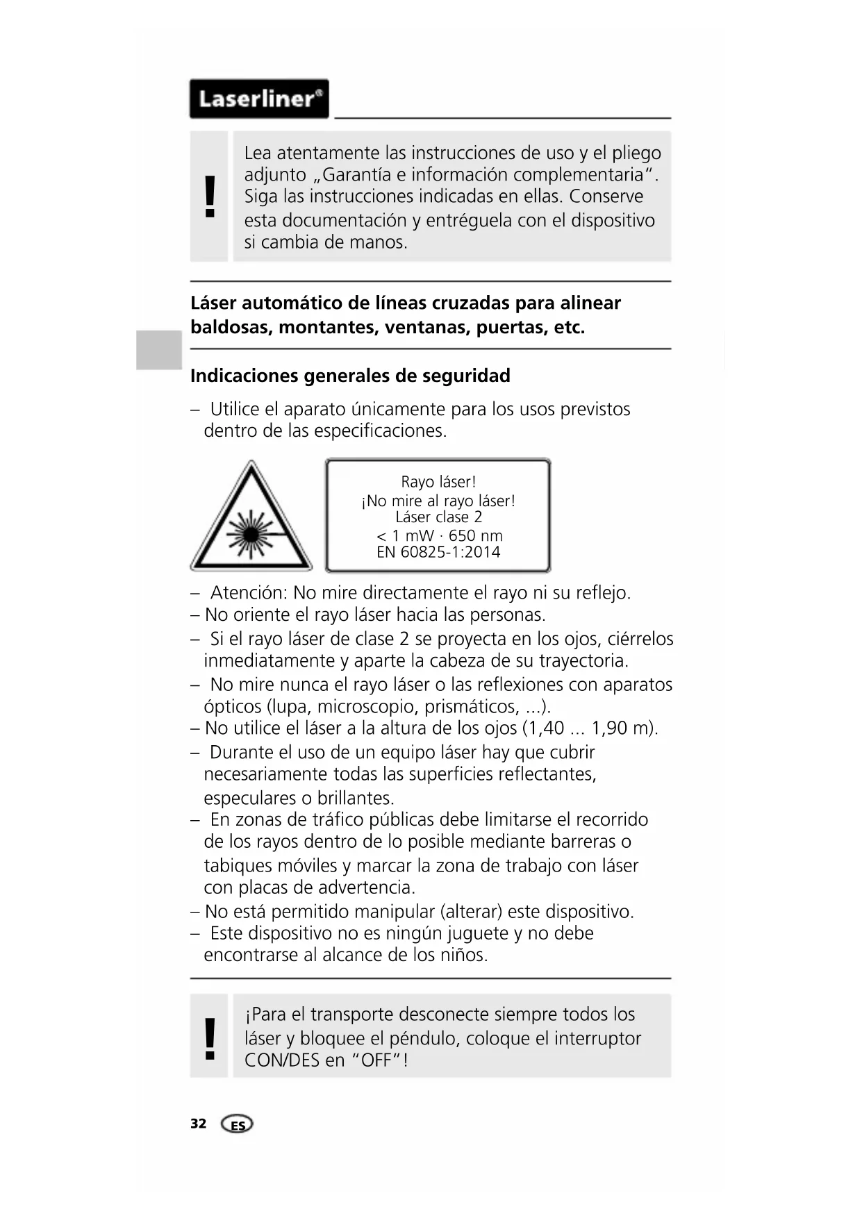 Indicaciones generales de seguridad – Atención: No mire directamente el rayo ni su reejo. – No oriente el rayo láser hacia las personas. – Si el rayo láser de clase 2 se proyecta en los ojos, ciérrelos inmediatamente y aparte la cabeza de su trayectoria. – No mire nunca el rayo láser o las reexiones con aparatos ópticos (lupa, microscopio, prismáticos, ...). – No utilice el láser a la altura de los ojos (1,40 ... 1,90 m). – Durante el uso de un equipo láser hay que cubrir necesariamente todas las supercies reectantes, especulares o brillantes. – En zonas de tráco públicas debe limitarse el recorrido de los rayos dentro de lo posible mediante barreras o tabiques móviles y marcar la zona de trabajo con láser con placas de advertencia. – No está permitido manipular (alterar) este dispositivo. – Este dispositivo no es ningún juguete y no debe encontrarse al alcance de los niños. – Utilice el aparato únicamente para los usos previstos dentro de las especicaciones. Rayo láser! ¡No mire al rayo láser! Láser clase 2 < 1 mW · 650 nm EN 60825-1:2014 Lea atentamente las instrucciones de uso y el pliego adjunto „Garantía e información complementaria“. Siga las instrucciones indicadas en ellas. Conserve esta documentación y entréguela con el dispositivo si cambia de manos.