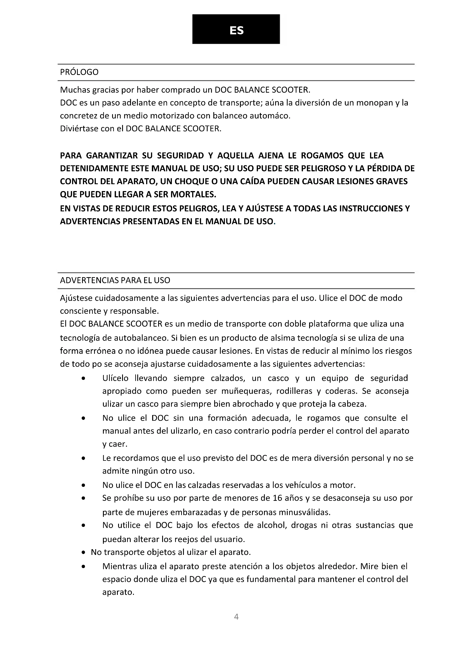 PRÓLOGO Muchas gracias por haber comprado un DOC BALANCE SCOOTER. DOC es un paso adelante en concepto de transporte; aúna la diversión de un monopatín y la concretez de un medio motorizado con balanceo automático. Diviértase con el DOC BALANCE SCOOTER. PARA GARANTIZAR SU SEGURIDAD Y AQUELLA AJENA LE ROGAMOS QUE LEA DETENIDAMENTE ESTE MANUAL DE USO; SU USO PUEDE SER PELIGROSO Y LA PÉRDIDA DE CONTROL DEL APARATO, UN CHOQUE O UNA CAÍDA PUEDEN CAUSAR LESIONES GRAVES QUE PUEDEN LLEGAR A SER MORTALES. EN VISTAS DE REDUCIR ESTOS PELIGROS, LEA Y AJÚSTESE A TODAS LAS INSTRUCCIONES Y ADVERTENCIAS PRESENTADAS EN EL MANUAL DE USO.