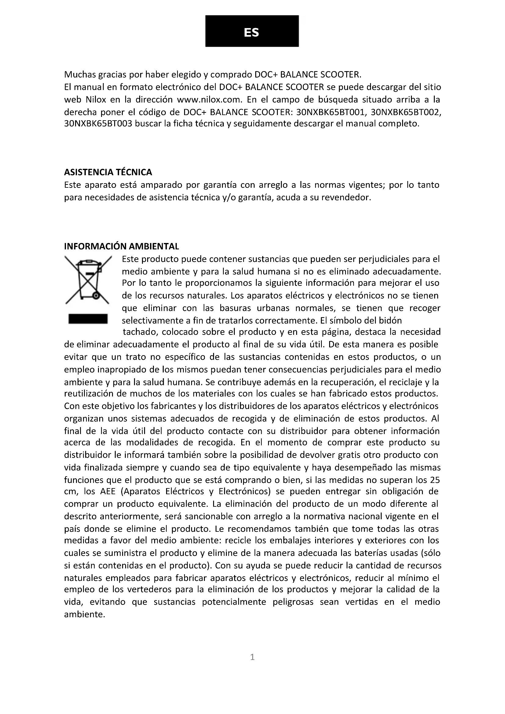 Muchas gracias por haber elegido y comprado DOC+ BALANCE SCOOTER. El manual en formato electrónico del DOC+ BALANCE SCOOTER se puede descargar del sitio web Nilox en la dirección www.nilox.com. En el campo de búsqueda situado arriba a la derecha poner el código de DOC+ BALANCE SCOOTER: 30NXBK65BT001, 30NXBK65BT002, 30NXBK65BT003 buscar la ficha técnica y seguidamente descargar el manual completo.