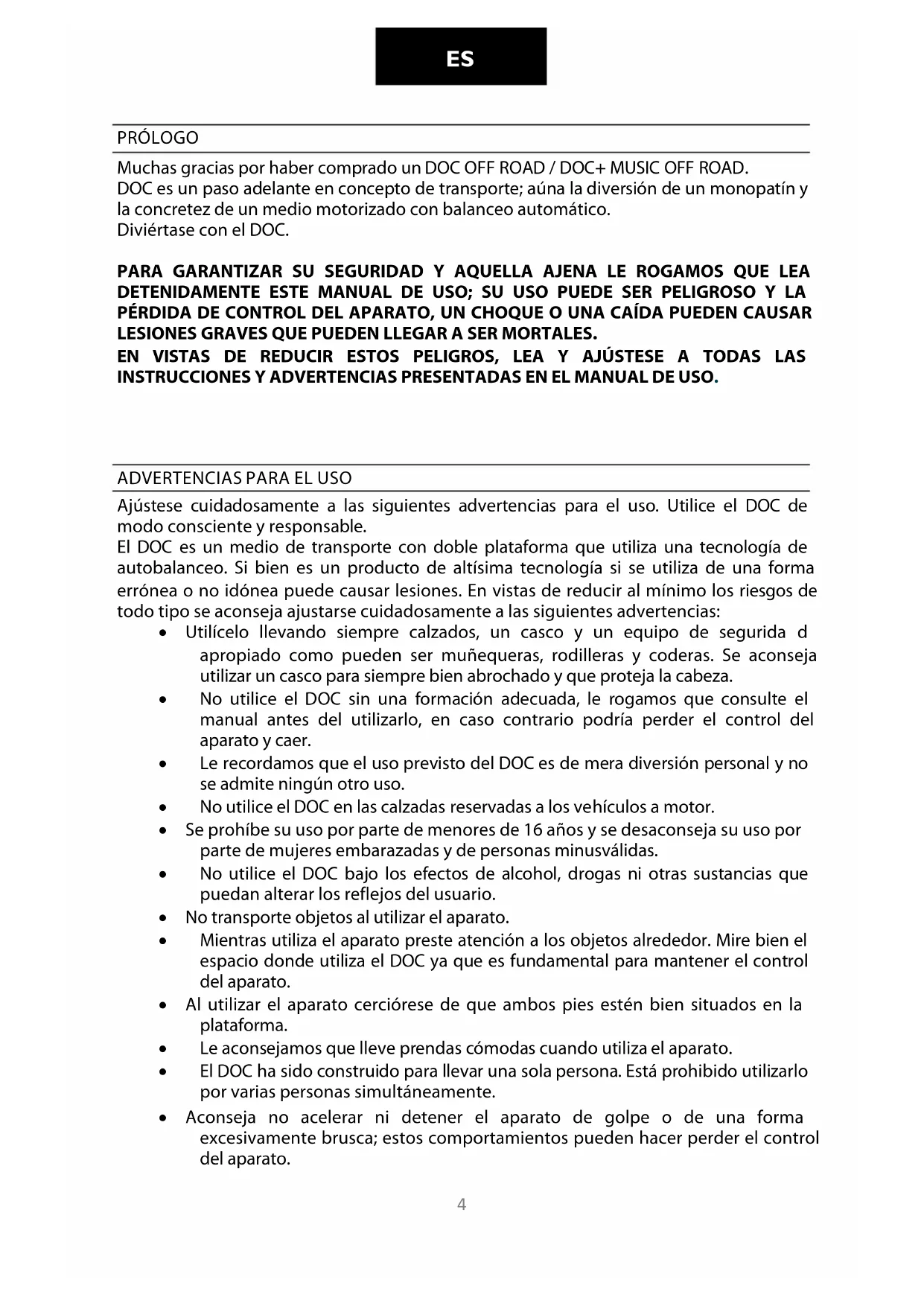PRÓLOGO Muchas gracias por haber comprado un DOC OFF ROAD / DOC+ MUSIC OFF ROAD. DOC es un paso adelante en concepto de transporte; aúna la diversión de un monopatín y la concretez de un medio motorizado con balanceo automático. Diviértase con el DOC. PARA GARANTIZAR SU SEGURIDAD Y AQUELLA AJENA LE ROGAMOS QUE LEA DETENIDAMENTE ESTE MANUAL DE USO; SU USO PUEDE SER PELIGROSO Y LA PÉRDIDA DE CONTROL DEL APARATO, UN CHOQUE O UNA CAÍDA PUEDEN CAUSAR LESIONES GRAVES QUE PUEDEN LLEGAR A SER MORTALES. EN VISTAS DE REDUCIR ESTOS PELIGROS, LEA Y AJÚSTESE A TODAS LAS INSTRUCCIONES Y ADVERTENCIAS PRESENTADAS EN EL MANUAL DE USO.