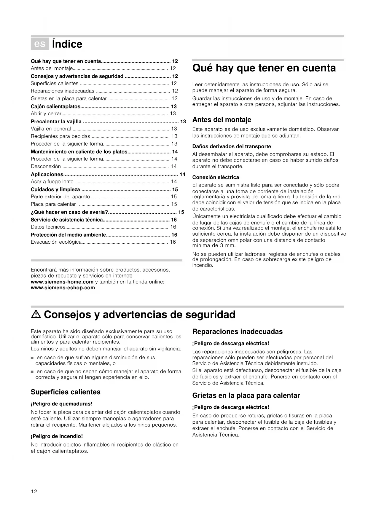 - Evacuación ecológica Produktinfo Encontrará más información sobre productos, accesorios, piezas de repuesto y servicios en internet: www.siemens-home.com y también en la tienda online: www.siemens-eshop.com Qué hay que tener en cuenta Leer detenidamente las instrucciones de uso. Sólo así se puede manejar el aparato de forma segura. Guardar las instrucciones de uso y de montaje. En caso de entregar el aparato a otra persona, adjuntar las instrucciones. Antes del montaje Este aparato es de uso exclusivamente doméstico. Observar las instrucciones de montaje que se adjuntan. Daños derivados del transporte Al desembalar el aparato, debe comprobarse su estado. El aparato no debe conectarse en caso de haber sufrido daños durante el transporte. Conexión eléctrica El aparato se suministra listo para ser conectado y sólo podrá conectarse a una toma de corriente de instalación reglamentaria y provista de toma a tierra. La tensión de la red debe coincidir con el valor de tensión que se indica en la placa de características. Únicamente un electricista cualificado debe efectuar el cambio de lugar de las cajas de enchufe o el cambio de la línea de conexión. Si una vez realizado el montaje, el enchufe no está lo suficiente cerca, la instalación debe disponer de un dispositivo de separación omnipolar con una distancia de contacto mínima de 3 mm. No se pueden utilizar ladrones, regletas de enchufes o cables de prolongación. En caso de sobrecarga existe peligro de incendio. ã=Consejos y advertencias de seguridad Este aparato ha sido diseñado exclusivamente para su uso doméstico. Utilizar el aparato sólo para conservar calientes los alimentos y para calentar recipientes. Los niños y adultos no deben manejar el aparato sin vigilancia: ■ en caso de que sufran alguna disminución de sus capacidades físicas o mentales, o ■ en caso de que no sepan cómo manejar el aparato de forma correcta y segura ni tengan experiencia en ello. Superficies calientes ¡Peligro de quemaduras! No tocar la placa para calentar del cajón calientaplatos cuando esté caliente. Utilizar siempre manoplas o agarradores para retirar el recipiente. Mantener alejados a los niños pequeños. ¡Peligro de incendio! No introducir objetos inflamables ni recipientes de plástico en el cajón calientaplatos. Reparaciones inadecuadas ¡Peligro de descarga eléctrica! Las reparaciones inadecuadas son peligrosas. Las reparaciones sólo pueden ser efectuadas por personal del Servicio de Asistencia Técnica debidamente instruido. Si el aparato está defectuoso, desconectar el fusible de la caja de fusibles y extraer el enchufe. Ponerse en contacto con el Servicio de Asistencia Técnica. Grietas en la placa para calentar ¡Peligro de descarga eléctrica! En caso de producirse roturas, grietas o fisuras en la placa para calentar, desconectar el fusible de la caja de fusibles y extraer el enchufe. Ponerse en contacto con el Servicio de Asistencia Técnica.13 Cajón calientaplatos En el cajón calientaplatos se puede precalentar la vajilla o mantener calientes los platos. El aparato sólo calienta si el cajón está debidamente cerrado. Abrir y cerrar En los aparatos sin tirador: Empujar la parte central del cajón para abrirlo o cerrarlo. Al abrir el cajón, éste salta ligeramente hacia fuera. Tras ello, puede extraerse sin problemas. Precalentar la vajilla En la vajilla previamente calentada, los alimentos no se enfrían tan rápidamente. Las bebidas se mantienen calientes durante más tiempo. Vajilla en general La carga máxima del cajón calientaplatos es de 25 kg. Puede precalentar, p. ej., vajilla para 6 o 12 personas. Colocar la vajilla Distribuir la vajilla por toda la superficie en la medida que sea posible. Una pila alta de platos se calienta más despacio que una sola pieza de la vajilla, como p. ej. 2 fuentes. Recipientes para bebidas Utilizar el nivel 2 para calentar recipientes para bebidas como tazas de café. ã=¡Peligro de quemaduras! En el nivel 3 o 4, los recipientes para bebidas se calienta demasiado. Proceder de la siguiente forma p. 16