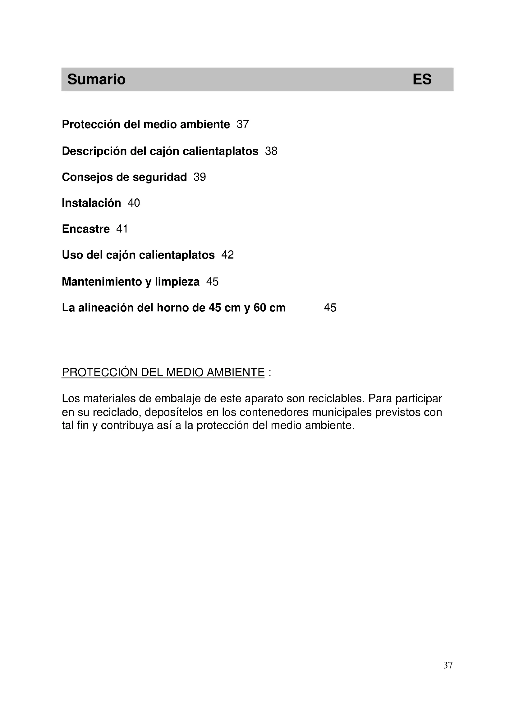 Protección del medio ambiente 37 Descripción del cajón calientaplatos 38 Consejos de seguridad 39 Instalación 40 Encastre 41 Uso del cajón calientaplatos 42 Mantenimiento y limpieza 45 La alineación del horno de 45 cm y 60 cm 45