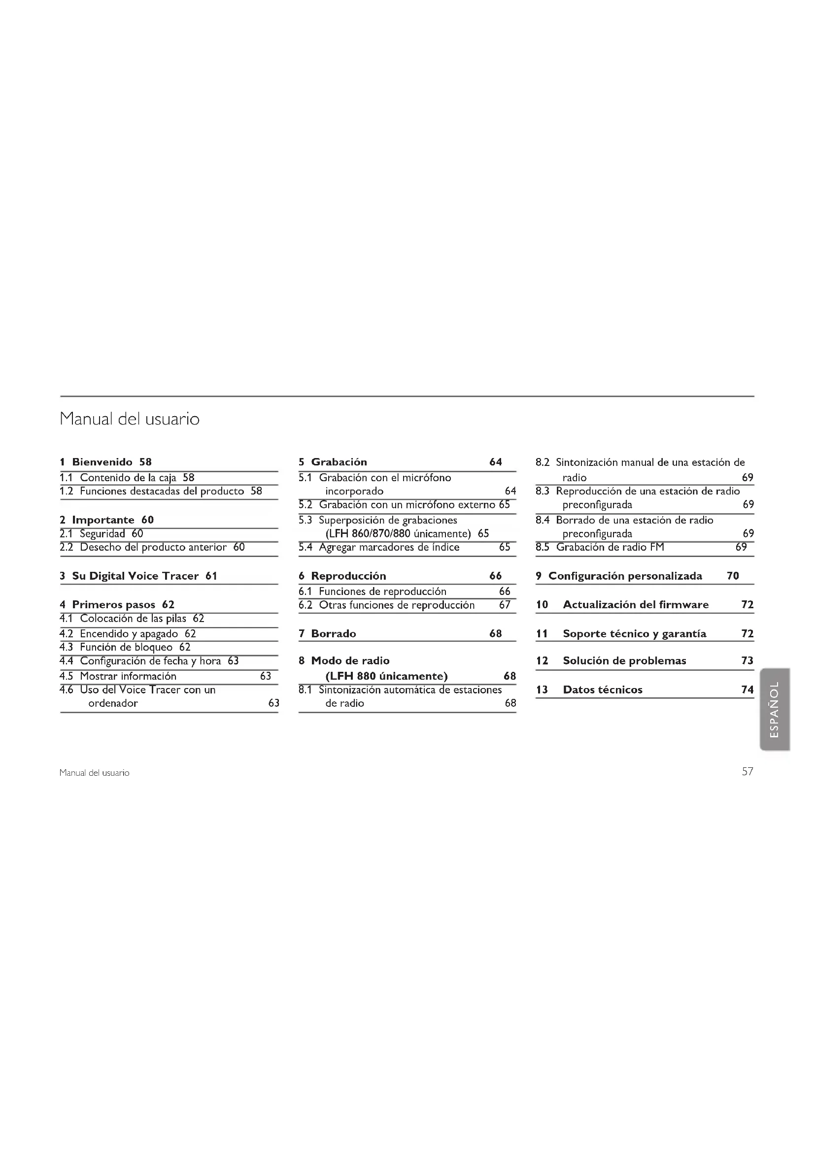 9 Configuración personalizada 70 10 Actualización del firmware 72 11 Soporte técnico y garantía 72 12 Solución de problemas 73 13 Datos técnicos 74 ESPAÑOL58 Manual del usuario Bienvenido1 Felicitaciones por su compra y bienvenido a Philips. Con el fin de aprovechar al máximo el respaldo ofrecido por Philips, visite nuestro sitio web para obtener información de soporte, como manuales del usuario, descargas de software e información sobre la garantía, entre otros: www.philips.com/dictation. Contenido de la caja1.1 Funciones destacadas del producto1.2 Grabación Graba en el popular formato MP3.• Posibilidad de elegir entre seis modos de grabación. Grabación PCM • estéreo sin comprimir* para obtener calidad de audio de CD, dos modos estéreo que incluyen SHG y HQ, o tres modos mono que incluyen SP, LP y SLP para obtener tiempos de grabación prolongados. La sensibilidad de grabación regulable evita los ruidos de fondo y se • ajusta al entorno de grabación. La memoria interna de gran amplitud brinda una excepcional • capacidad de grabación, y permite realizar y almacenar grabaciones extensas. El modo de• grabación con activación por voz brinda la posibilidad de llevar a cabo grabaciones sin necesidad de utilizar las manos ni preocuparse por pulsar el botón de grabación. La función de división automática divide en forma automática las • grabaciones extensas en archivos separados. Esto permite que las grabaciones extensas, como reuniones, sean mucho más fáciles de buscar, editar y archivar. Grabación con alimentación a través de un cable USB sin necesidad de • consumir la carga de las baterías.* Manual del usuario Pilas Auriculares estéreo * Cable USB Micrófono de solapaVoice Tracer Correa *59 Manual del usuario Grabación desde fuentes de audio externas a través de una línea de • entrada.* La amplia relación señal-ruido (s/n) del micrófono capta todos los • detalles de la voz humana para brindar una excelente reproducción del sonido. Reproducción Velocidad de reproducción regulable para reproducir grabaciones en • modos de alta y baja velocidad. Reproducción reiterada de un archivo de audio completo o de una • sección del mismo mediante la opción de repetición de reproducción. Disfrute de la música con formato MP3 y WMA, y de la radio FM *.• Reloj despertador con reproducción de voz y grabación con • temporizador. Comodidad Amplia pantalla iluminada para una cómoda visualización. • Disfrute de hasta 22 horas de funcionamiento continuo.• Transfiera grabaciones, música y datos rápidamente a través del • puerto USB 2.0 de alta velocidad. Las funciones de marcador de índice y marcador de tiempo permiten • encontrar rápidamente las ubicaciones deseadas en una grabación. Admite hasta 99 grabaciones en cada una de las cuatro carpetas • disponibles para organizar los archivos de manera fácil y rápida. Al tratarse de un dispositivo de almacenamiento masivo USB, el Voice • Tracer ofrece una cómoda manera de guardar, respaldar y trasladar archivos sin necesidad de utilizar software ni instalar controladores especiales.