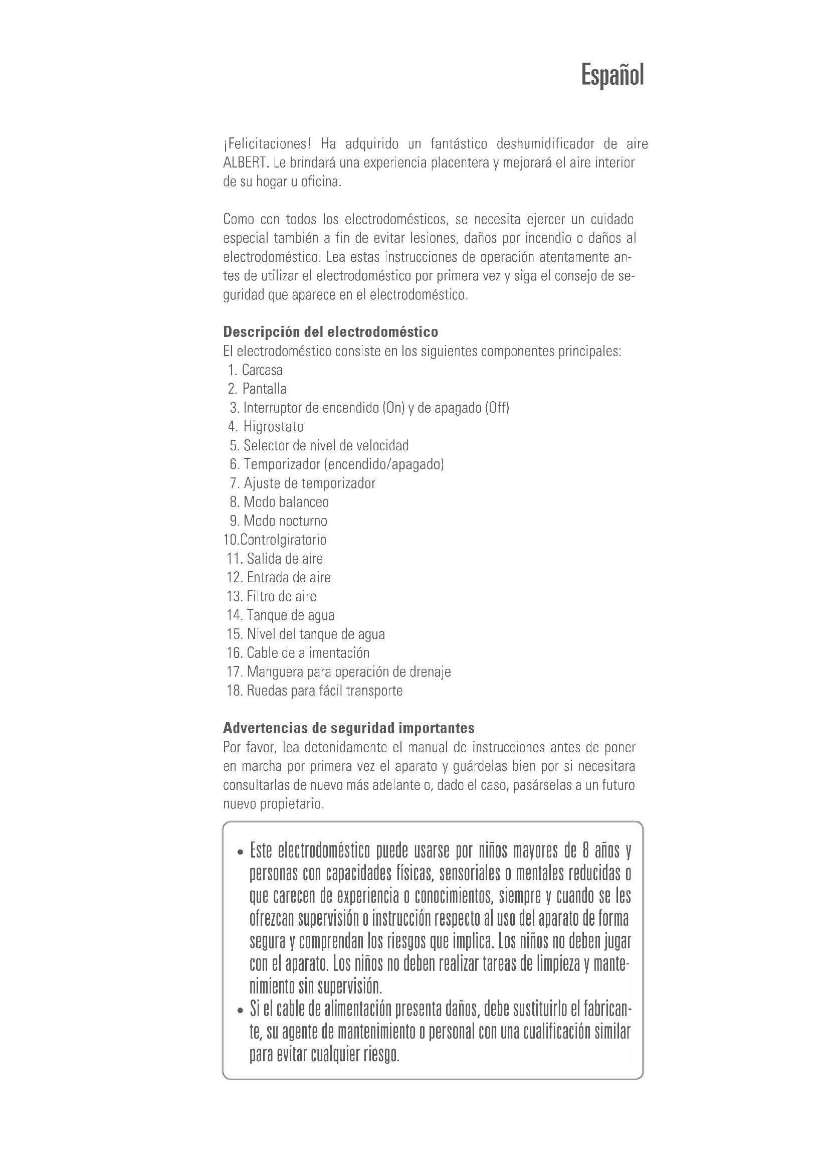 Advertencias de seguridad importantes Por favor, lea detenidamente el manual de instrucciones antes de poner en marcha por primera vez el aparato y guárdelas bien por si necesitara consultarlas de nuevo más adelante o, dado el caso, pasárselas a un futuro nuevo propietario. Español