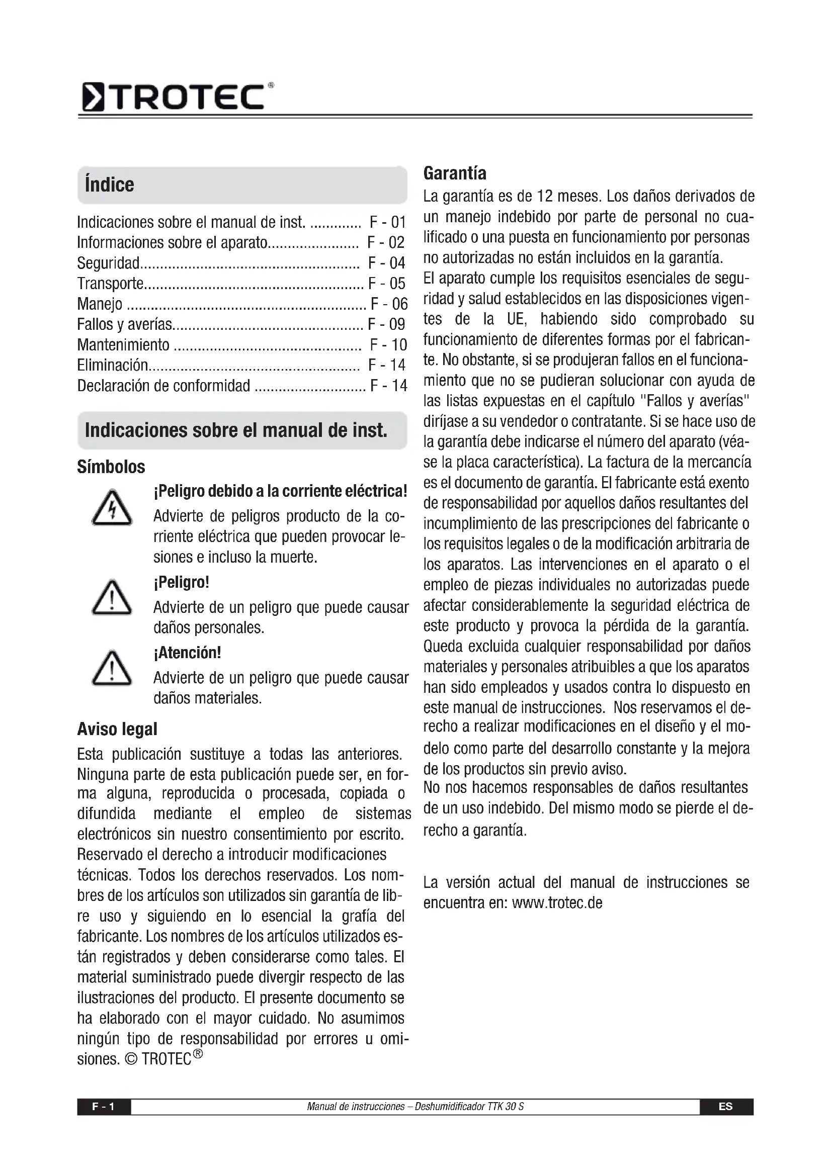 IEC 62233:2005 Fabrikant: Trotec GmbH & Co. KG Telefoon:+49 2452 962-400 Grebbener Straße 7 Fax: +49 2452 962-200 D-52525 Heinsberg E-mail: info@trotec.de Heinsberg, 19-04-2012 Bedrijfsleider: Detlef von der Lieck Recycling ConformiteitsverklaringF - 1 Manual de instrucciones – Deshumidificador TTK 30 S ES Indicaciones sobre el manual de inst. ............. F - 01 Informaciones sobre el aparato....................... F - 02 Seguridad....................................................... F - 04 Transporte....................................................... F - 05 Manejo ............................................................ F - 06 Fallos y averías................................................ F - 09 Mantenimiento ............................................... F - 10 Eliminación..................................................... F - 14 Declaración de conformidad ............................ F - 14 Símbolos ¡Peligro debido a la corriente eléctrica! Advierte de peligros producto de la co- rriente eléctrica que pueden provocar le- siones e incluso la muerte. ¡Peligro! Advierte de un peligro que puede causar daños personales. ¡Atención! Advierte de un peligro que puede causar daños materiales. Aviso legal Esta publicación sustituye a todas las anteriores. Ninguna parte de esta publicación puede ser, en for- ma alguna, reproducida o procesada, copiada o difundida mediante el empleo de sistemas electrónicos sin nuestro consentimiento por escrito. Reservado el derecho a introducir modificaciones técnicas. Todos los derechos reservados. Los nom- bres de los artículos son utilizados sin garantía de lib- re uso y siguiendo en lo esencial la grafía del fabricante. Los nombres de los artículos utilizados es- tán registrados y deben considerarse como tales. El material suministrado puede divergir respecto de las ilustraciones del producto. El presente documento se ha elaborado con el mayor cuidado. No asumimos ningún tipo de responsabilidad por errores u omi- siones. © TROTEC