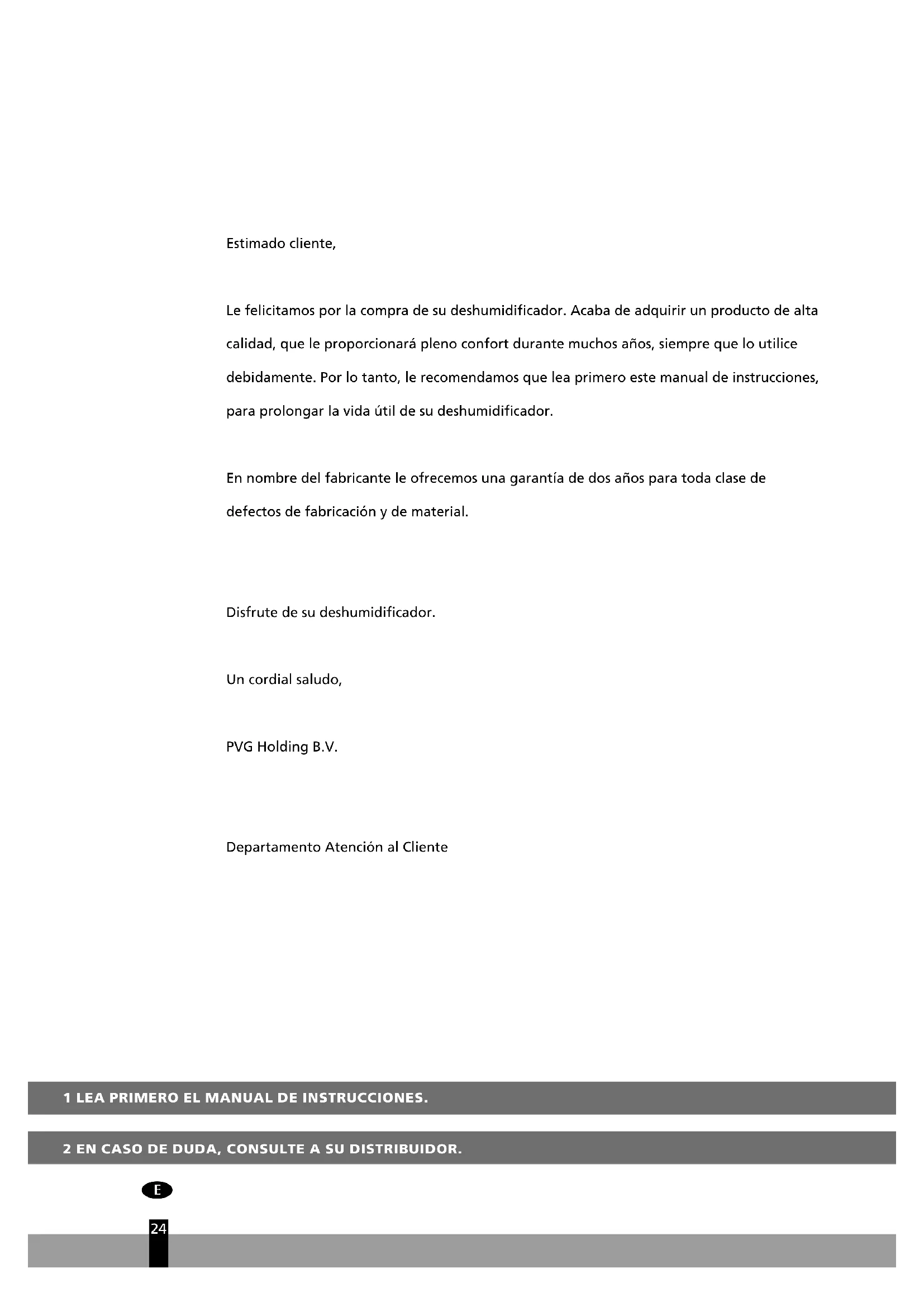Estimado cliente, Le felicitamos por la compra de su deshumidificador. Acaba de adquirir un producto de alta calidad, que le proporcionará pleno confort durante muchos años, siempre que lo utilice debidamente. Por lo tanto, le recomendamos que lea primero este manual de instrucciones, para prolongar la vida útil de su deshumidificador. En nombre del fabricante le ofrecemos una garantía de dos años para toda clase de defectos de fabricación y de material. Disfrute de su deshumidificador. Un cordial saludo, PVG Holding B.V. Departamento Atención al ClienteCOMPONENTES PRINCIPALES Panel de control Botón regulador/ higrostáto Salida del aire seco Depósito extraíble de agua Entrada para aire húmedo Filtro de aire Tubo de evacuación (ø 13 mm) con tapón Enchufe y cable Asa