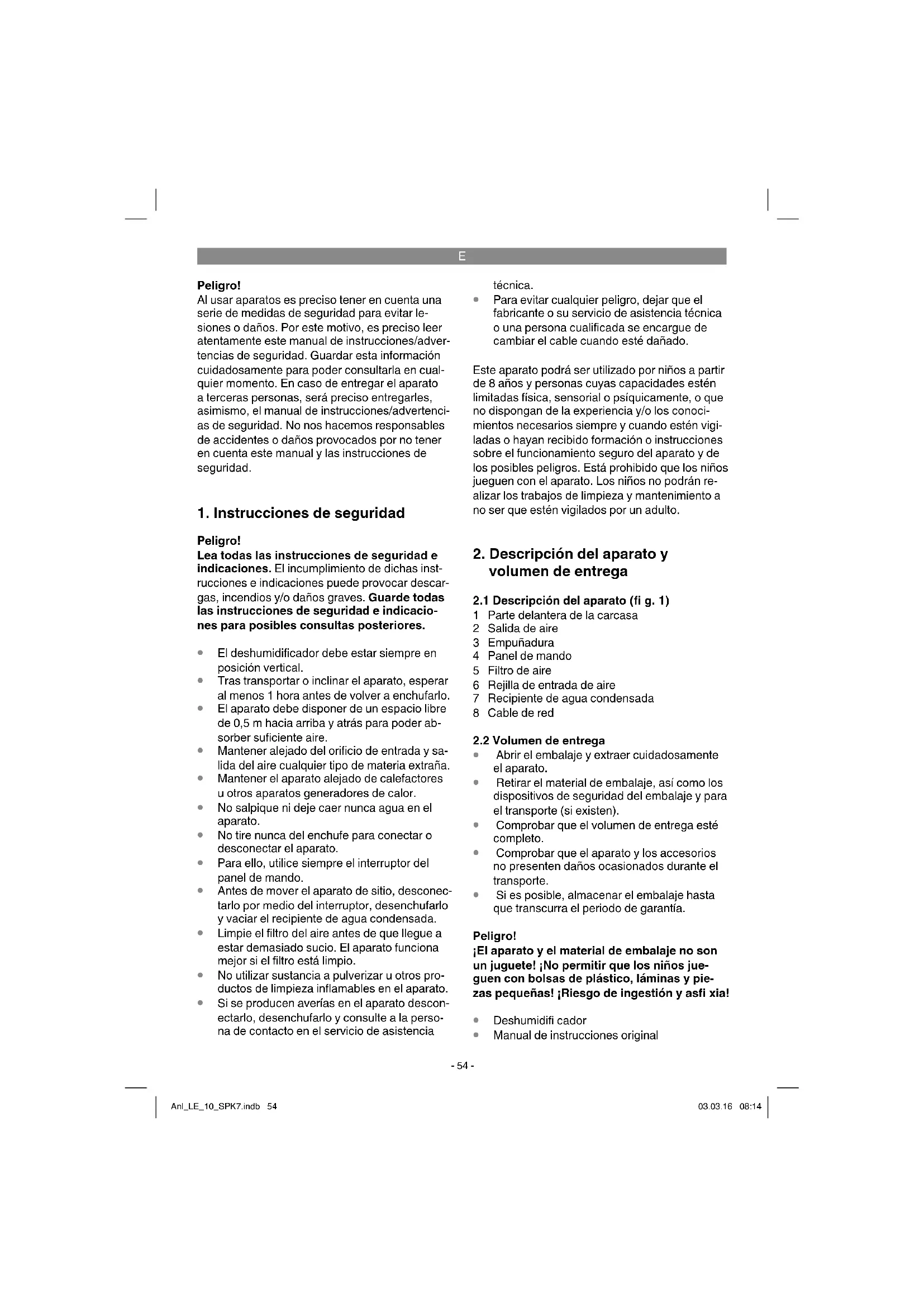 Si es posible, almacenar el embalaje hasta que transcurra el periodo de garantía. Peligro! ¡El aparato y el material de embalaje no son un juguete! ¡No permitir que los niños jue- guen con bolsas de plástico, láminas y pie- zas pequeñas! ¡Riesgo de ingestión y asfi xia!