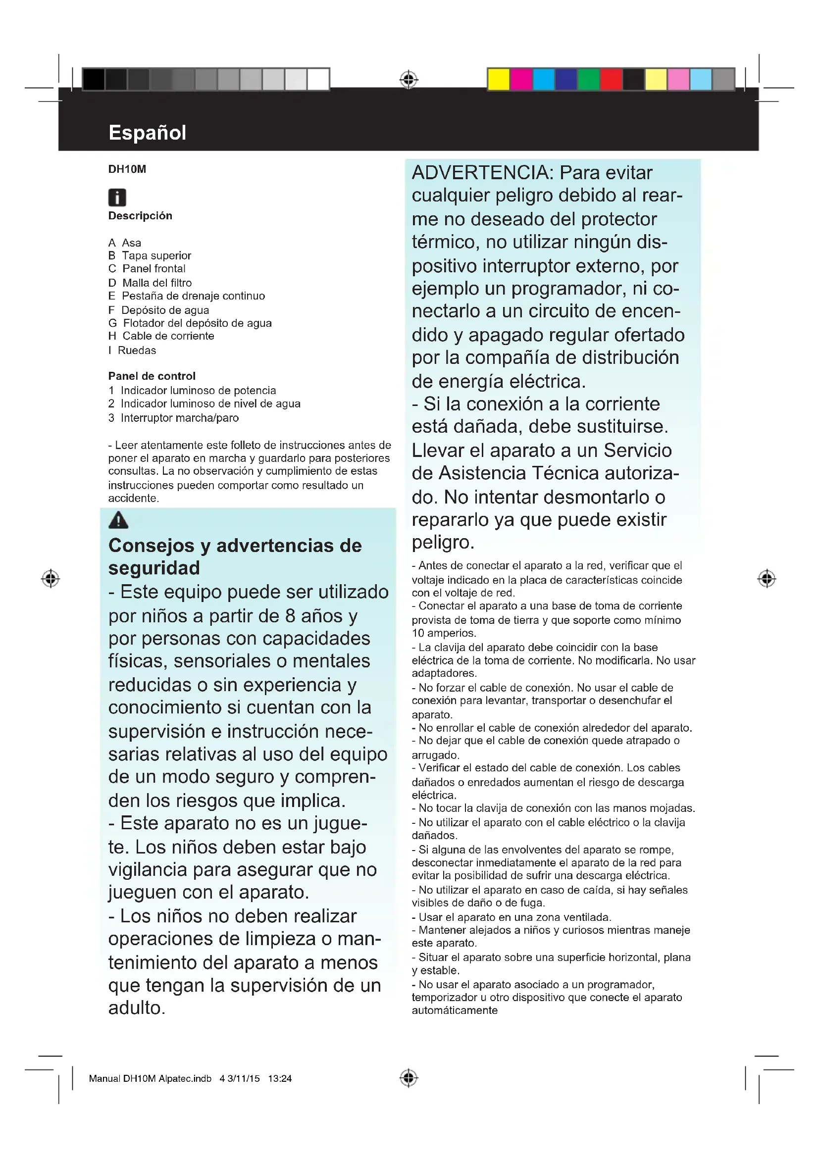 Manual DH10M Alpatec.indb 2 3/11/15 13:24Fig.2Fig.1 Fig.3 Fig.4 Fig.5 Manual DH10M Alpatec.indb 3 3/11/15 13:24Español DH10M Descripción A Asa B Tapa superior C Panel frontal D Malla del ltro E Pestaña de drenaje continuo F Depósito de agua G Flotador del depósito de agua H Cable de corriente I Ruedas Panel de control 1 Indicador luminoso de potencia 2 Indicador luminoso de nivel de agua 3 Interruptor marcha/paro - Leer atentamente este folleto de instrucciones antes de poner el aparato en marcha y guardarlo para posteriores consultas. La no observación y cumplimiento de estas instrucciones pueden comportar como resultado un accidente. Consejos y advertencias de seguridad - Este equipo puede ser utilizado por niños a partir de 8 años y por personas con capacidades físicas, sensoriales o mentales reducidas o sin experiencia y conocimiento si cuentan con la supervisión e instrucción nece- sarias relativas al uso del equipo de un modo seguro y compren- den los riesgos que implica. - Este aparato no es un jugue- te. Los niños deben estar bajo vigilancia para asegurar que no jueguen con el aparato. - Los niños no deben realizar operaciones de limpieza o man- tenimiento del aparato a menos que tengan la supervisión de un adulto. ADVERTENCIA: Para evitar cualquier peligro debido al rear- me no deseado del protector térmico, no utilizar ningún dis- positivo interruptor externo, por ejemplo un programador, ni co- nectarlo a un circuito de encen- dido y apagado regular ofertado por la compañía de distribución de energía eléctrica. - Si la conexión a la corriente está dañada, debe sustituirse. Llevar el aparato a un Servicio de Asistencia Técnica autoriza- do. No intentar desmontarlo o repararlo ya que puede existir peligro. - Antes de conectar el aparato a la red, vericar que el voltaje indicado en la placa de características coincide con el voltaje de red. - Conectar el aparato a una base de toma de corriente provista de toma de tierra y que soporte como mínimo 10 amperios. - La clavija del aparato debe coincidir con la base eléctrica de la toma de corriente. No modicarla. No usar adaptadores. - No forzar el cable de conexión. No usar el cable de conexión para levantar, transportar o desenchufar el aparato. - No enrollar el cable de conexión alrededor del aparato. - No dejar que el cable de conexión quede atrapado o arrugado. - Vericar el estado del cable de conexión. Los cables dañados o enredados aumentan el riesgo de descarga eléctrica. - No tocar la clavija de conexión con las manos mojadas. - No utilizar el aparato con el cable eléctrico o la clavija dañados. - Si alguna de las envolventes del aparato se rompe, desconectar inmediatamente el aparato de la red para evitar la posibilidad de sufrir una descarga eléctrica. - No utilizar el aparato en caso de caída, si hay señales visibles de daño o de fuga. - Usar el aparato en una zona ventilada. - Mantener alejados a niños y curiosos mientras maneje este aparato. - Situar el aparato sobre una supercie horizontal, plana y estable. - No usar el aparato asociado a un programador, temporizador u otro dispositivo que conecte el aparato automáticamente Manual DH10M Alpatec.indb 4 3/11/15 13:24- No utilizar ni guardar el aparato a la intemperie. - No utilizar el aparato con las manos o los pies húme- dos, ni descalzo. - No forzar el cable de conexión. No usar el cable de conexión para levantar, transportar o desenchufar el aparato. Utilización y cuidados: - Antes de cada uso, desenrollar completamente el cable de alimentación del aparato - No usar el aparato si su dispositivo de puesta en mar- cha/paro no funciona. - No retirar las ruedas del aparato. - No mover el aparato mientras está en uso. - Utilizar las asas del aparato para sostenerlo o despla- zarlo. - No utilizar el aparato inclinado, ni darle la vuelta. - Si se usa el aparato en un cuarto de baño o similar, desenchufar el aparato de la red cuando no esté en uso, aunque sea por poco tiempo, ya que la proximidad del agua presenta un riesgo, incluso con el aparato desconectado. - Desenchufar el aparato de la red cuando no se use y antes de realizar cualquier operación de limpieza. - Este aparato está pensado únicamente para un uso doméstico, no para uso profesional o industrial. - Guardar este aparato fuera del alcance de los niños y/o personas discapacitadas. - No guardar el aparato en lugares donde la temperatura ambiente pueda ser inferior a 5ºC. - No exponer el aparato a temperaturas extremas. - Toda utilización inadecuada, o en desacuerdo con las instrucciones de uso, puede comportar peligro, anulando la garantía y la responsabilidad del fabricante. Instalación - Asegurarse de que se ha retirado todo el material de embalaje del producto. - No retirar la base o las ruedas del aparato. - Dejar un mínimo de 20 cm de espacio alrededor del aparato. - El rango de temperatura ambiente para el aparato es de 5ºC-35ºC. Modo de empleo Uso: - Desenrollar completamente el cable antes de enchufar el aparato. - Conectar el aparato a la red eléctrica. - Cuando está conectado, esté en funcionamiento o no, se encenderá el indicador de encendido/apagado. - Pulsar este botón para encender/apagar la unidad. - No desenchufar directamente de la red. Indicador de nivel de llenado de agua: - Cuando el depósito de agua está lleno, se ilumina el indicador luminoso - Vaciar el depósito y volver a ponerlo en la posición correcta. Drenaje de agua: - El indicador del nivel de llenado de agua se ilumina en rojo cuando se alcanza la capacidad máxima de 1,5 litros. - Sacar el depósito de agua y vaciarlo. - Volver a colocarlo. ADVERTENCIA: - No retirar el otador del depósito de agua; en caso contrario, la máquina seguiría funcionando al alcanzar su capacidad máxima. Como consecuencia, el agua rebosaría y podría dañar su suelo. (Fig. 1) - Drenar el agua del depósito cuando esté lleno y resta- blecer los ajustes. - Si el depósito de agua est