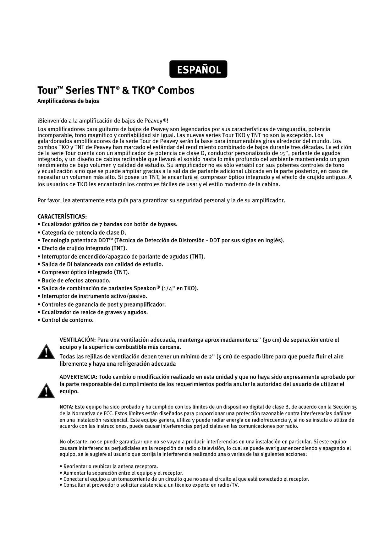 Los amplificadores para guitarra de bajos de Peavey son legendarios por sus características de vanguardia, potencia incomparable, tono magnífico y confiabilidad sin igual. Las nuevas series Tour TKO y TNT no son la excepción. Los galardonados amplificadores de la serie Tour de Peavey serán la base para innumerables giras alrededor del mundo. Los combos TKO y TNT de Peavey han marcado el estándar del rendimiento combinado de bajos durante tres décadas. La edición de la serie Tour cuenta con un amplificador de potencia de clase D, conductor personalizado de 15", parlante de agudos integrado, y un diseño de cabina reclinable que llevará el sonido hasta lo más profundo del ambiente manteniendo un gran rendimiento de bajo volumen y calidad de estudio. Su amplificador no es sólo versátil con sus potentes controles de tono y ecualización sino que se puede ampliar gracias a la salida de parlante adicional ubicada en la parte posterior, en caso de necesitar un volumen más alto. Si posee un TNT, le encantará el compresor óptico integrado y el efecto de crujido antiguo. A los usuarios de TKO les encantarán los controles fáciles de usar y el estilo moderno de la cabina. Por favor, lea atentamente esta guía para garantizar su seguridad personal y la de su amplificador. CARACTERÍSTICAS: