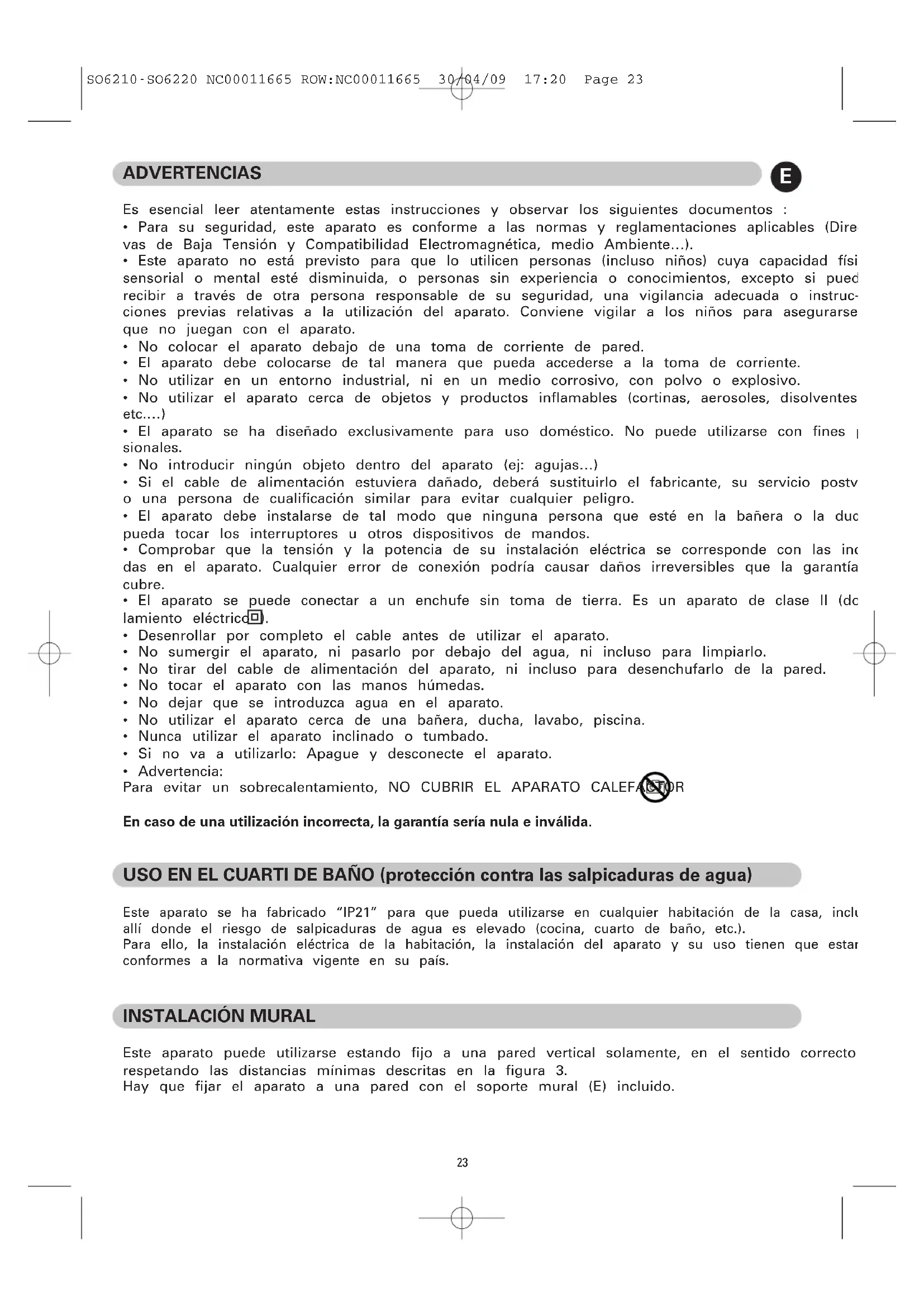 SO6210-SO6220 NC00011665 ROW:NC00011665 30/04/09 17:20 Page 2223 ADVERTENCIAS Es esencial leer atentamente estas instrucciones y observar los siguientes documentos :