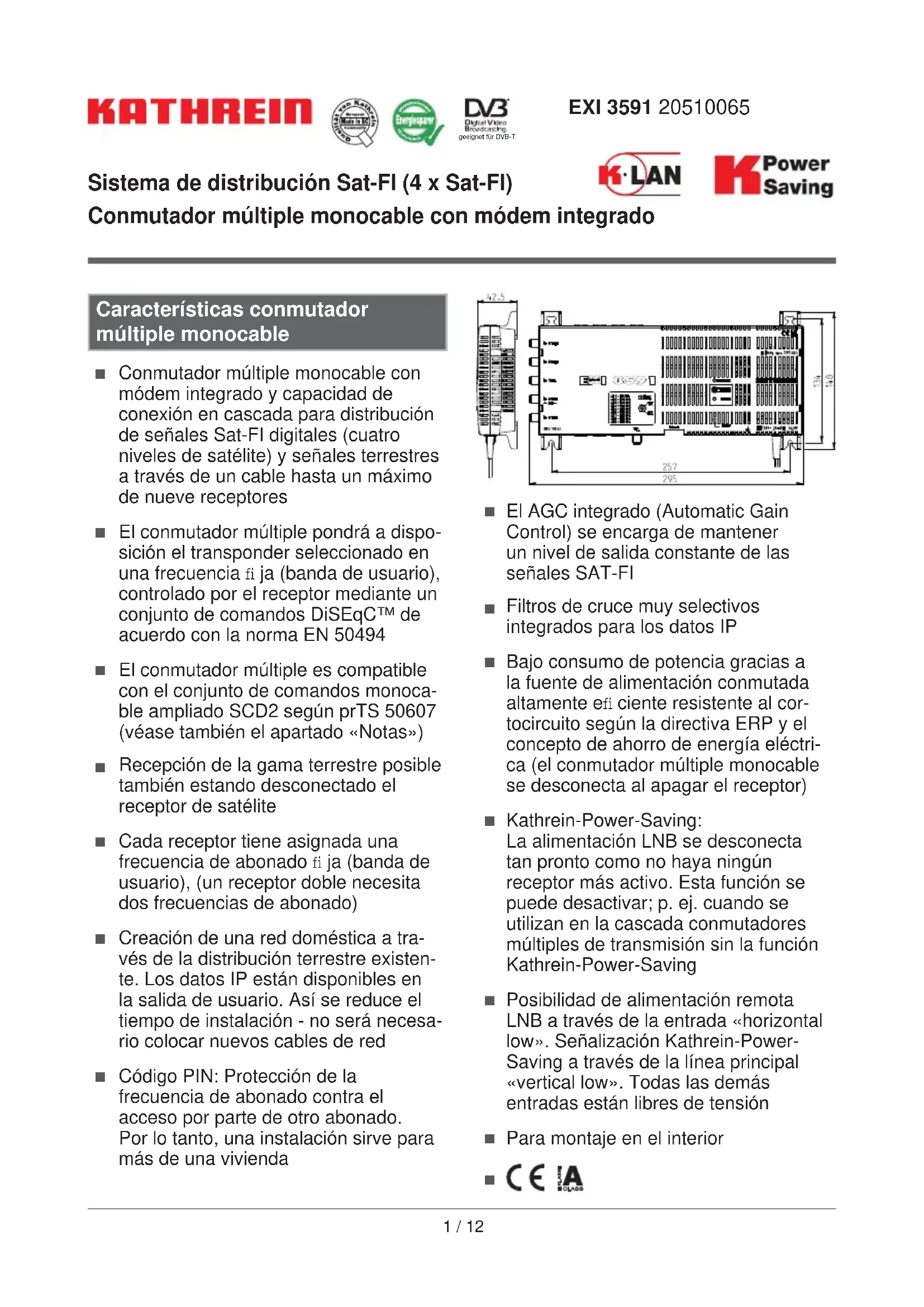 - Conmutador multiple monocable con módem integrado y capacidad de connexion en cascada para distribución de senales Sat-FI digitales (cuatro niveles de satélite) y senales terrestres a工程技术 de un cable hasta un máximo de neue receptores