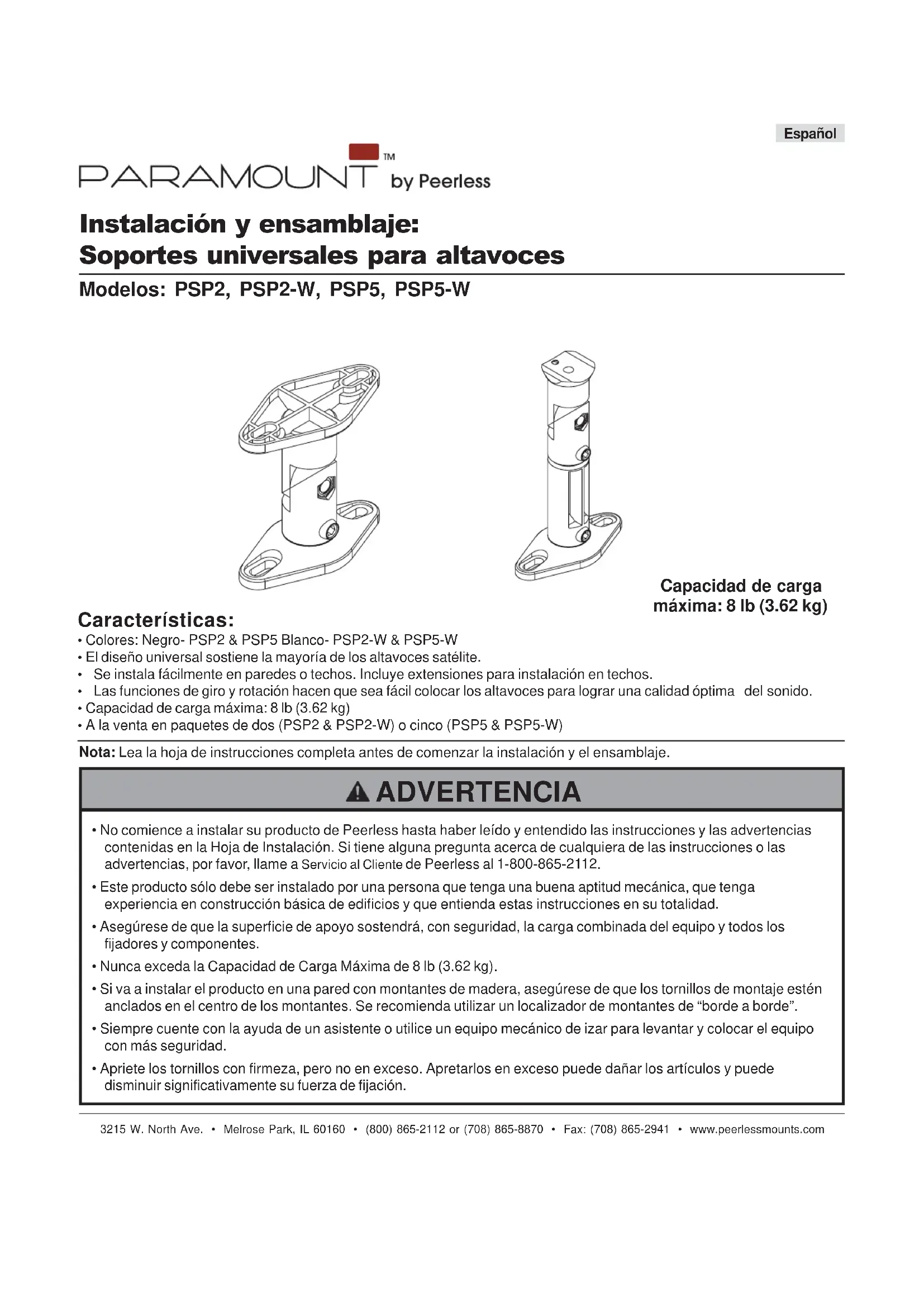 PSP2W - Soportes para altavoces Peerless-AV - Manual de uso y guía de instrucciones gratis