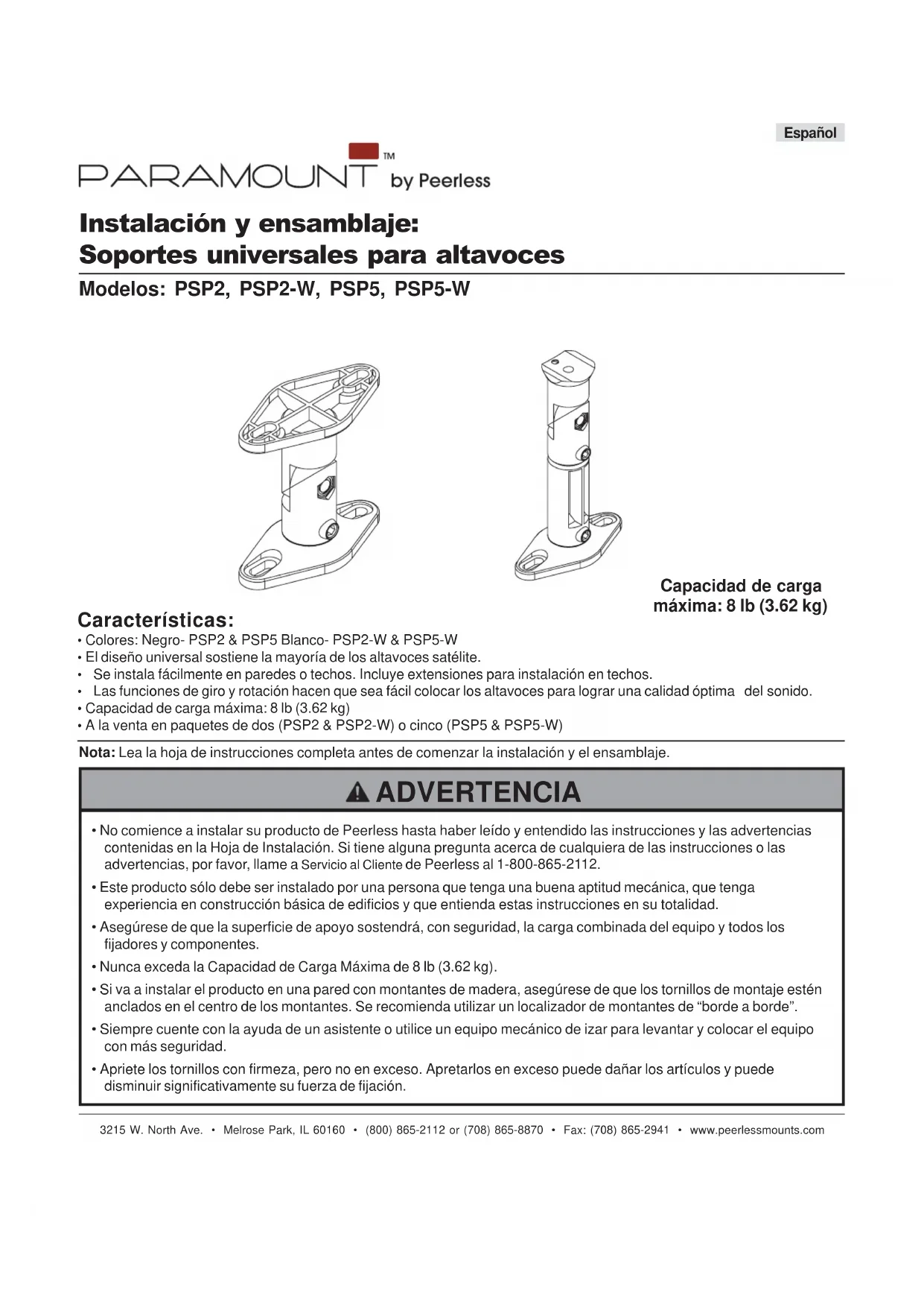 A or B A or B C3215 W. North Ave. • Melrose Park, IL 60160 • (800) 865-2112 or (708) 865-8870 • Fax: (708) 865-2941 • www.peerlessmounts.com Instalación y ensamblaje: Soportes universales para altavoces Modelos: PSP2, PSP2-W, PSP5, PSP5-W Español Características: