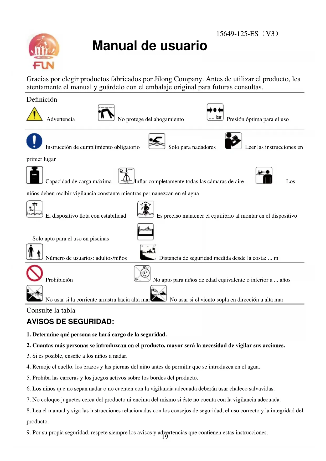 Gracias por elegir productos fabricados por Jilong Company. Antes de utilizar el producto, lea atentamente el manual y guárdelo con el embalaje original para futuras consultas. Definición Advertencia No protege del ahogamiento Presión óptima para el uso Instrucción de cumplimiento obligatorio Solo para nadadores Leer las instrucciones en primer lugar Capacidad de carga máxima Inflar completamente todas las cámaras de aire Los niños deben recibir vigilancia constante mientras permanezcan en el agua El dispositivo flota con estabilidad Es preciso mantener el equilibrio al montar en el dispositivo Solo apto para el uso en piscinas Número de usuarios: adultos/niños Distancia de seguridad medida desde la costa: ... m Prohibición No apto para niños de edad equivalente o inferior a ... años No usar si la corriente arrastra hacia alta mar No usar si el viento sopla en dirección a alta mar Consulte la tabla AVISOS DE SEGURIDAD: 1. Determine qué persona se hará cargo de la seguridad. 2. Cuantas más personas se introduzcan en el producto, mayor será la necesidad de vigilar sus acciones. 3. Si es posible, enseñe a los niños a nadar. 4. Remoje el cuello, los brazos y las piernas del niño antes de permitir que se introduzca en el agua. 5. Prohíba las carreras y los juegos activos sobre los bordes del producto. 6. Los niños que no sepan nadar o no cuenten con la vigilancia adecuada deberán usar chaleco salvavidas. 7. No coloque juguetes cerca del producto ni encima del mismo si éste no cuenta con la vigilancia adecuada. 8. Lea el manual y siga las instrucciones relacionadas con los consejos de seguridad, el uso correcto y la integridad del producto. 9. Por su propia seguridad, respete siempre los avisos y advertencias que contienen estas instrucciones. 15649-125-SE(V2) Manual de usuario 15649-125-ES(V3)20