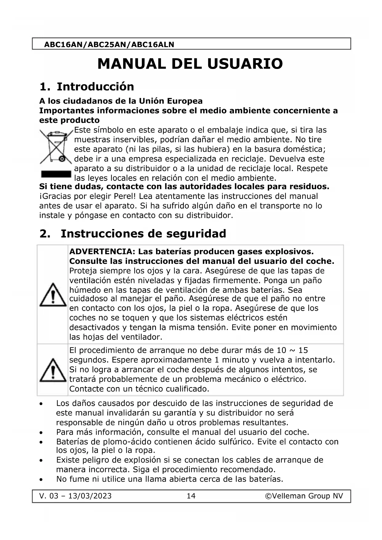 Velleman Group NV dispone de los derechos de autor para este manual del usuario. Todos los derechos mundiales reservados. Está estrictamente prohibido reproducir, traducir, copiar, editar y guardar este manual del usuario o partes de ello sin el consentimiento previo por escrito del propietario del copyright.ABC16AN/ABC25AN/ABC16ALN