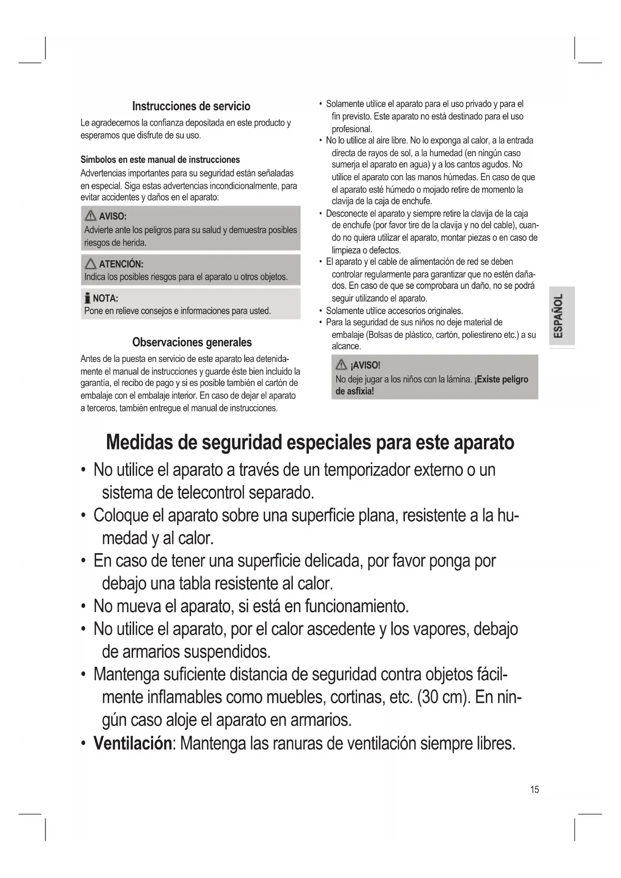 - Para la seguridad de sus niños no deje material de embalaje (Bolsas de plástico, cartón, poliestireno etc.) a su alcance. ¡AVISO! No deje jugar a los niños con la lámina. ¡Existe peligro de asxia! Medidas de seguridad especiales para este aparato