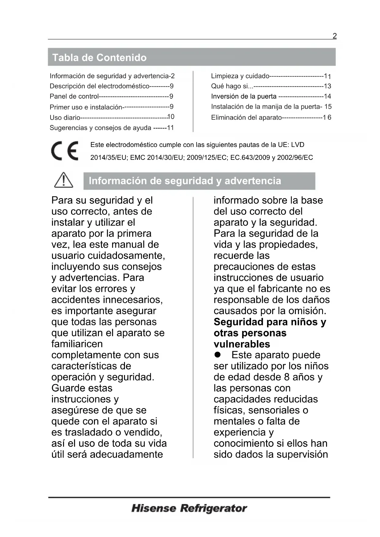 Correct Disposal of this product This marking indicates that this product should not be disposed with other household wastes throughout the EU. To prevent possible harm to the environment or human health from uncontrolled waste disposal, recycle it responsibly to promote the sustainable reuse of material resources. To return your used device, please use the return and collection systems or contact the retailer where the product was purchased. They can take this product for environmental safe recycling. 14Tabla de Contenido Este electrodoméstico cumple con las siguientes pautas de la UE: LVD 2014/35/EU; EMC 2014/30/EU; 2009/125/EC; EC.643/2009 y 2002/96/EC Información de seguridad y advertencia Para su seguridad y el uso correcto, antes de instalar y utilizar el aparato por la primera vez, lea este manual de usuario cuidadosamente, incluyendo sus consejos y advertencias. Para evitar los errores y accidentes innecesarios, es importante asegurar que todas las personas que utilizan el aparato se familiaricen completamente con sus características de operación y seguridad. Guarde estas instrucciones y asegúrese de que se quede con el aparato si es trasladado o vendido, así el uso de toda su vida útil será adecuadamente informado sobre la base del uso correcto del aparato y la seguridad. Para la seguridad de la vida y las propiedades, recuerde las precauciones de estas instrucciones de usuario ya que el fabricante no es responsable de los daños causados por la omisión. Seguridad para niños y otras personas vulnerables Este aparato puede ser utilizado por los niños de edad desde 8 años y las personas con capacidades reducidas físicas, sensoriales o mentales o falta de experiencia y conocimiento si ellos han sido dados la supervisión Limpieza y cuidado------------------------1 Qué hago si...-------------------------------13 Inversión de la puerta --------------------14 Instalación de la manija de la puerta- 15 Eliminación del aparato------------------1 Información de seguridad y advertencia-2 Descripción del electrodoméstico---------9 Panel de control-------------------------------9 Primer uso e instalación-