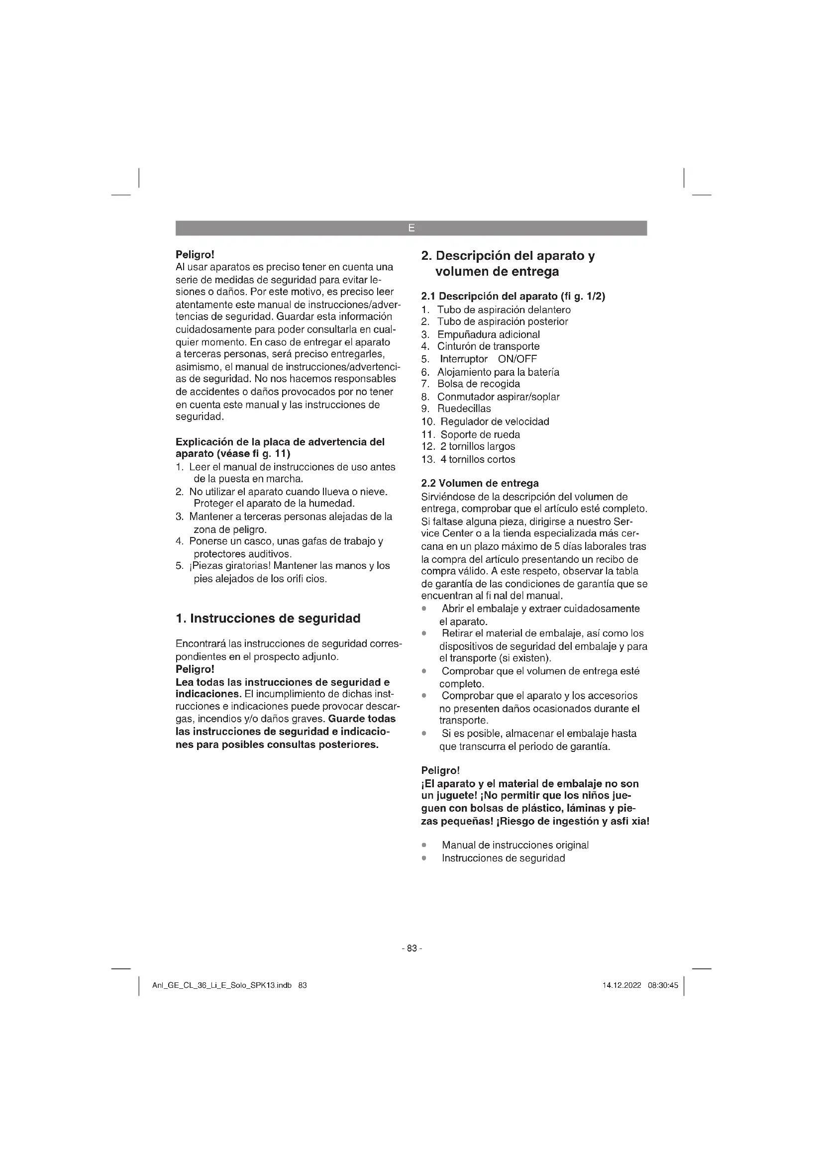 6.1. Determinar la longitud del cinturón (fi g. 1) Regular la longitud del cinturón (4) de tal forma que el tubo de aspiración apenas llegue al suelo. Adicionalmente, los rodillos guía (9), situados en el extremo del tubo de aspiración, sirven para guiar ligeramente a éste. Anl_GE_CL_36_Li_E_Solo_SPK13.indb 85Anl_GE_CL_36_Li_E_Solo_SPK13.indb 85 14.12.2022 08:30:4614.12.2022 08:30:46E