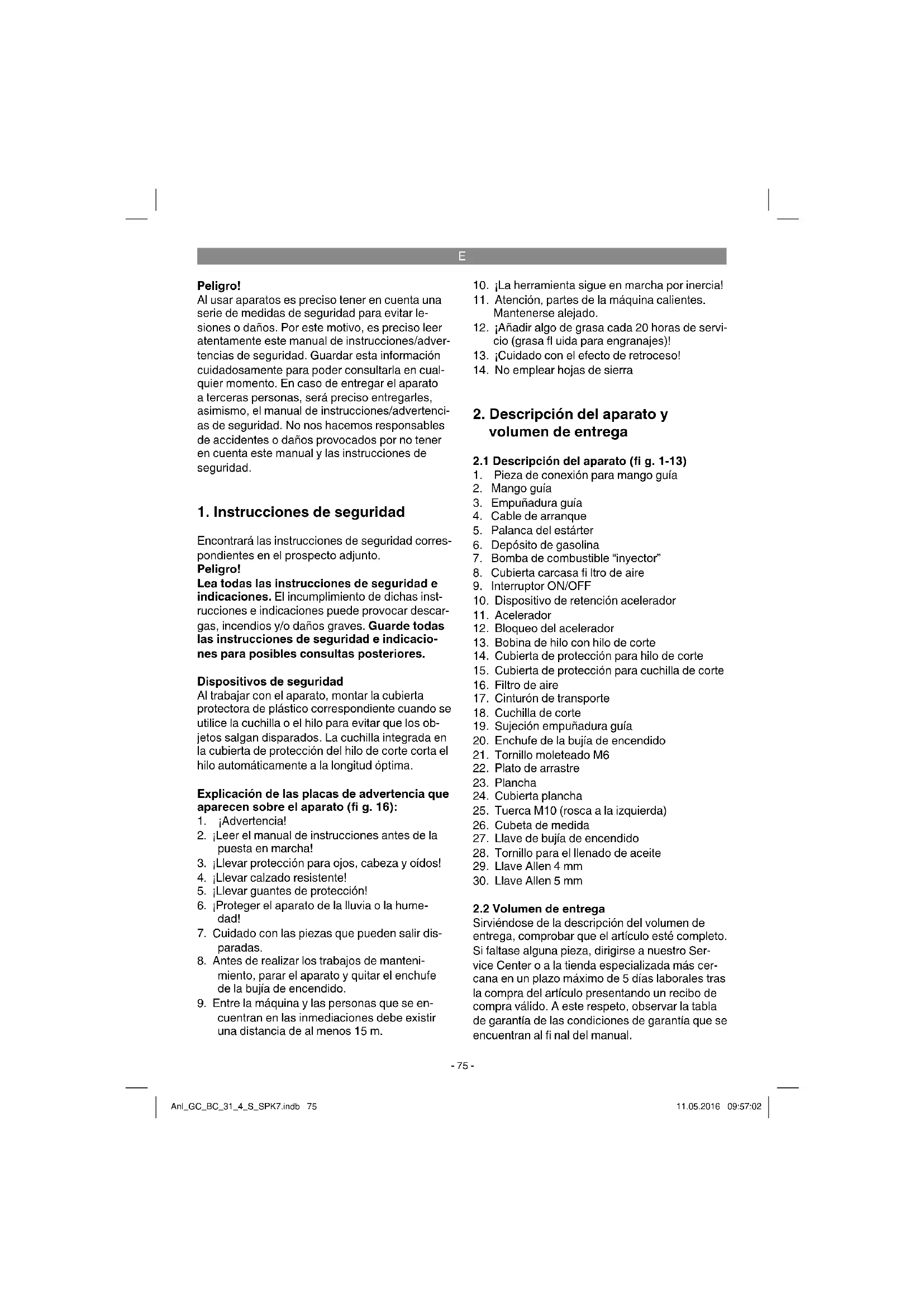 Sirviéndose de la descripción del volumen de entrega, comprobar que el artículo esté completo. Si faltase alguna pieza, dirigirse a nuestro Ser- vice Center o a la tienda especializada más cer- cana en un plazo máximo de 5 días laborales tras la compra del artículo presentando un recibo de compra válido. A este respeto, observar la tabla de garantía de las condiciones de garantía que se encuentran al fi nal del manual. Anl_GC_BC_31_4_S_SPK7.indb 75Anl_GC_BC_31_4_S_SPK7.indb 75 11.05.2016 09:57:0211.05.2016 09:57:02E