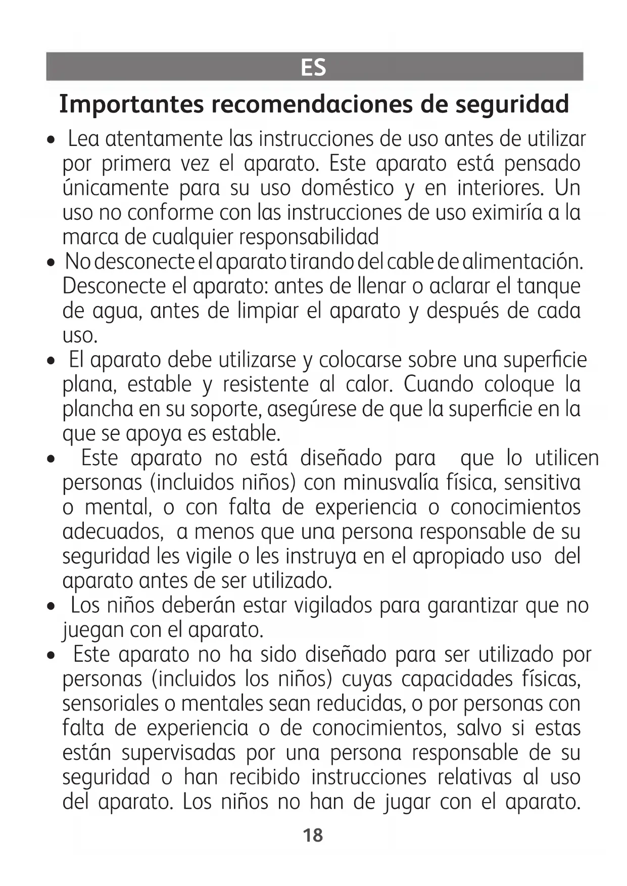 - Este aparato no ha sido diseñado para ser utilizado por personas (incluidos los niños) cuyas capacidades físicas, sensoriales o mentales sean reducidas, o por personas con falta de experiencia o de conocimientos, salvo si estas están supervisadas por una persona responsable de su seguridad o han recibido instrucciones relativas al uso del aparato. Los niños no han de jugar con el aparato. 18La limpieza y el mantenimiento de usuario no los han de llevar a cabo niños sin supervisión. Mantenga la plancha y su cable fuera del alcance de niños menores de 8 años mientras la plancha esté conectada o enfriándose.