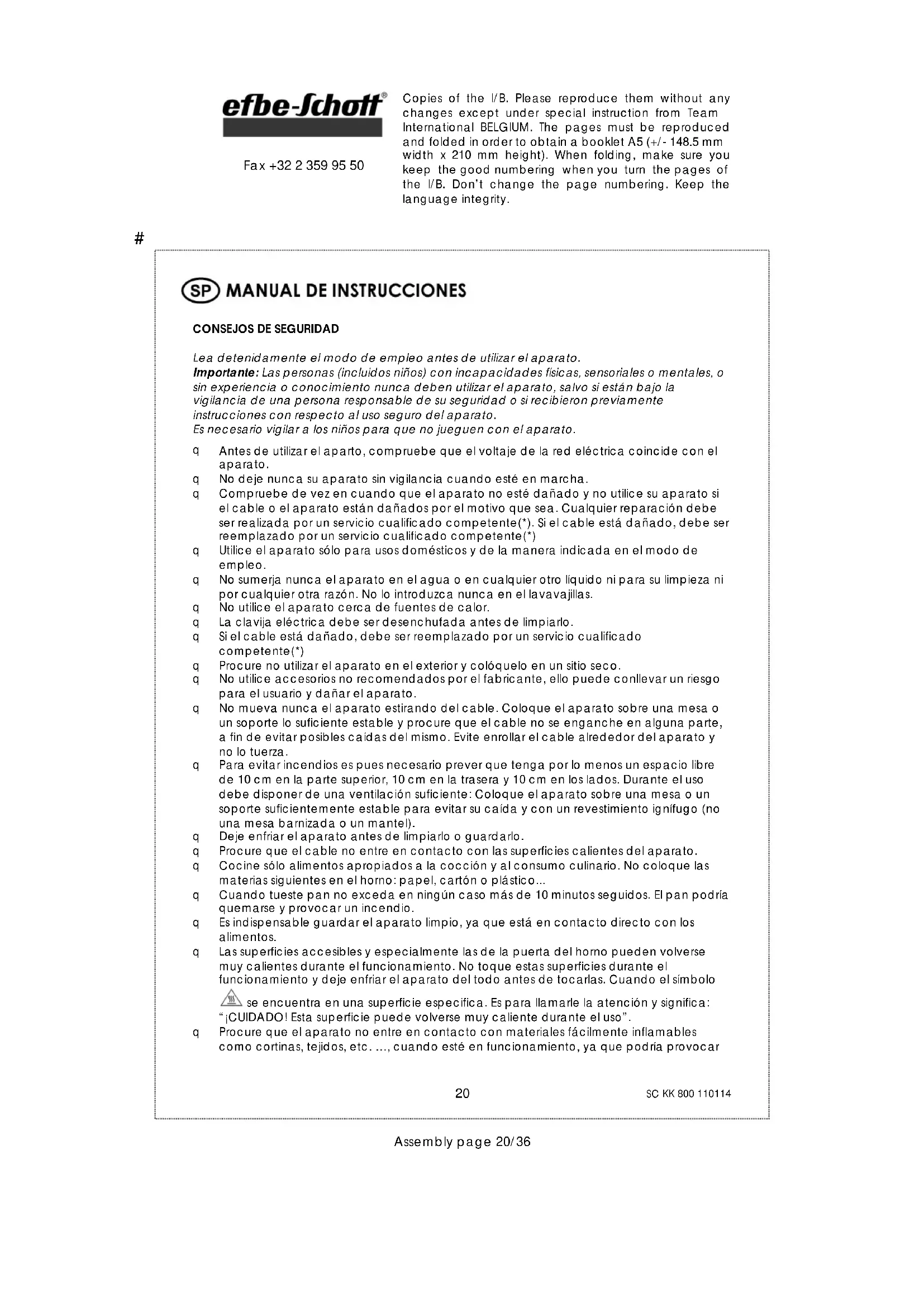 SC KK 800 110114 Assembly page 23/36 Fax +32 2 359 95 50 PROTECCIÓN DEL MEDIO AMBIENTE –DIRECTIVA 2002/96/CE Para poder preservar nuestro medio ambiente y proteger la salud humana, los residuos eléctricos y equipos electrónicos deberían ser destruidos de acuerdo con unas normas especificas con la implicación de ambos proveedores y consumidores. Por esta razón, como indica el símbolo en la placa de datos técnicos, su aparato no debería ser tirado en un contenedor municipal sino que debería ser devuelto a la tienda, o dejado en un punto de recolección para ser reciclado o usado para otras aplicaciones conforme a la directiva.# Copies of the I/B. Please reproduce them without any changes except under special instruction from Team International BELGIUM. The pages must be reproduced and folded in order to obtain a booklet A5 (+/- 148.5 mm width x 210 mm height). When folding, make sure you keep the good numbering when you turn the pages of the I/B. Don’t change the page numbering. Keep the language integrity.