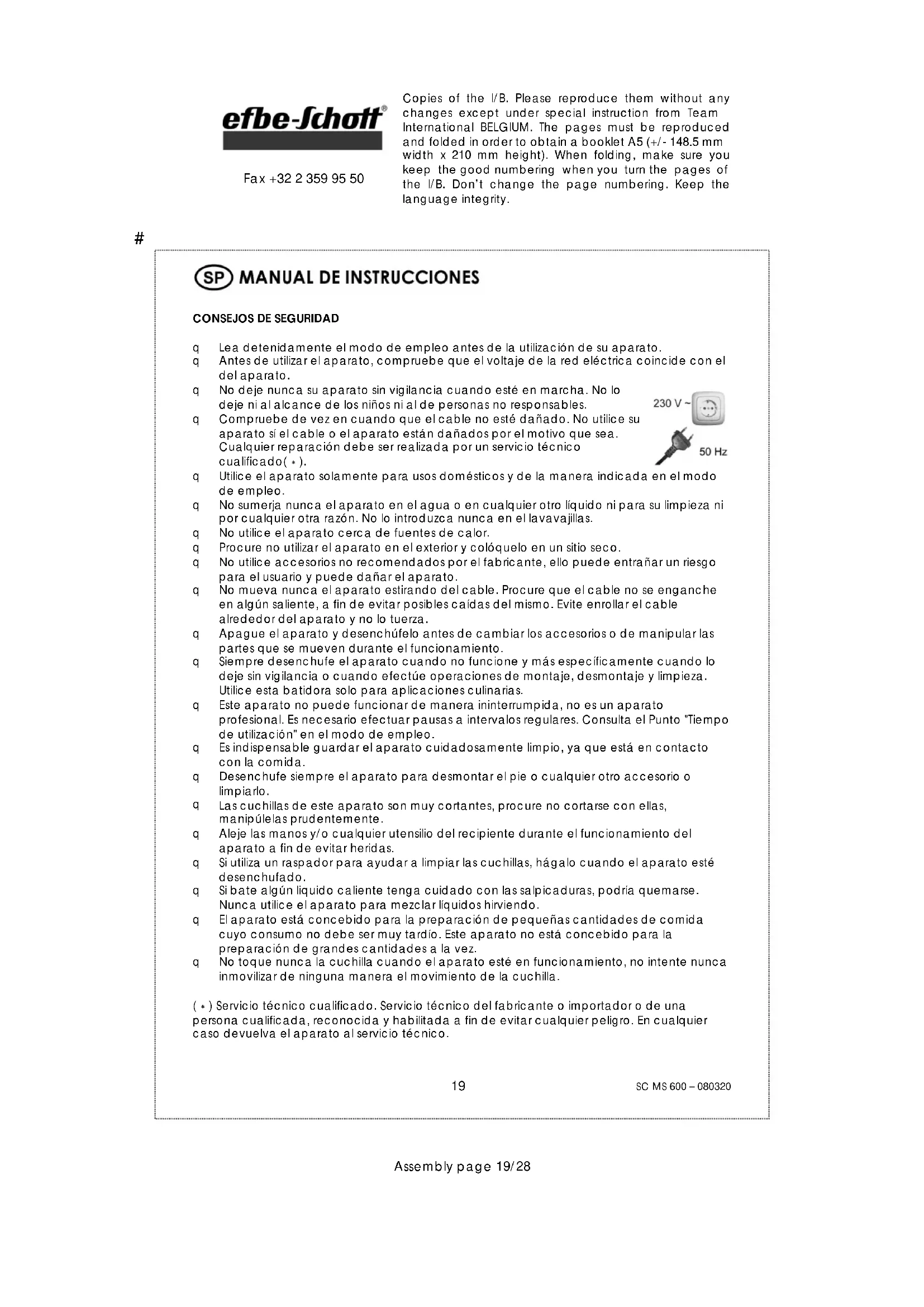 No toque nunca la cuchilla cuando el aparato esté en funcionamiento, no intente nunca inmovilizar de ninguna manera el movimiento de la cuchilla. (∗) Servicio técnico cualificado. Servicio técnico del fabricante o importador o de una persona cualificada, reconocida y habilitada a fin de evitar cualquier peligro. En cualquier caso devuelva el aparato al servicio técnico.# Copies of the I/B. Please reproduce them without any changes except under special instruction from Team International BELGIUM. The pages must be reproduced and folded in order to obtain a booklet A5 (+/- 148.5 mm width x 210 mm height). When folding, make sure you keep the good numbering when you turn the pages of the I/B. Don’t change the page numbering. Keep the language integrity.