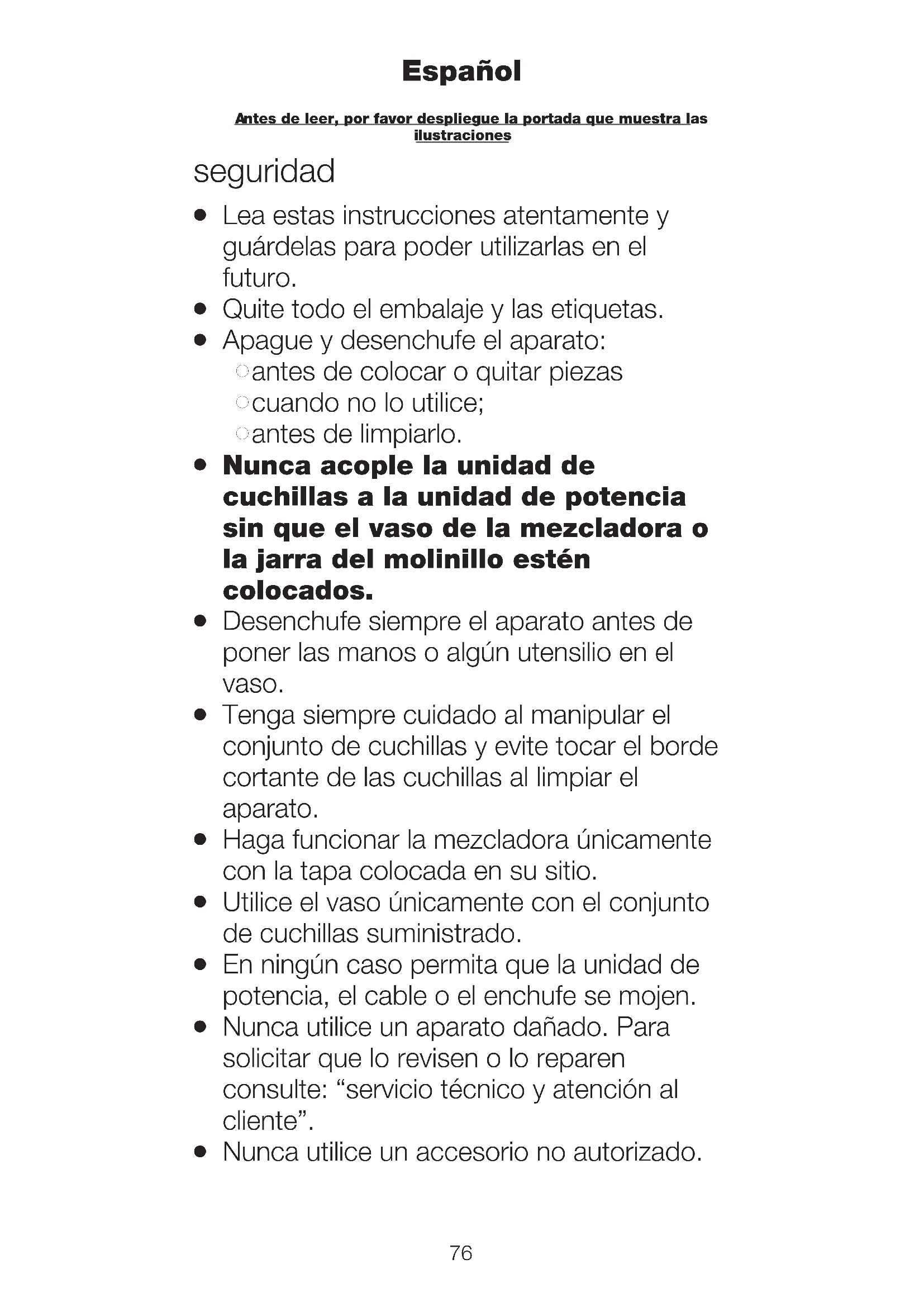 ntes de leer, por favor despliegue la portada que muestra las lustraciones EspañolG RIESGO DE ESCALDARSE: Deje que los ingredientes calientes se enfríen hasta que alcancen la temperatura ambiente antes de mezclarlos.