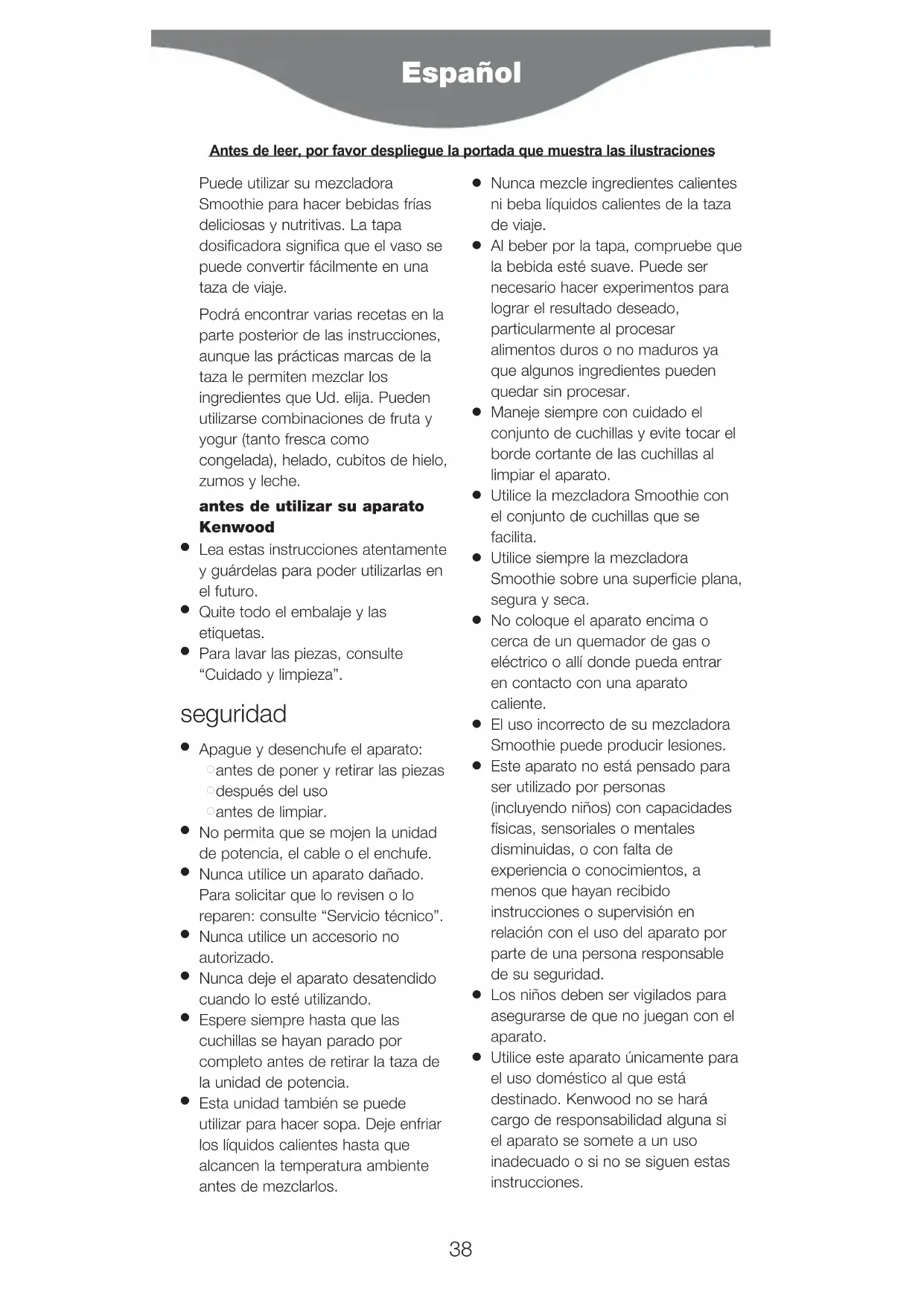 Utilice este aparato únicamente para el uso doméstico al que está destinado. Kenwood no se hará cargo de responsabilidad alguna si el aparato se somete a un uso inadecuado o si no se siguen estas instrucciones. Español